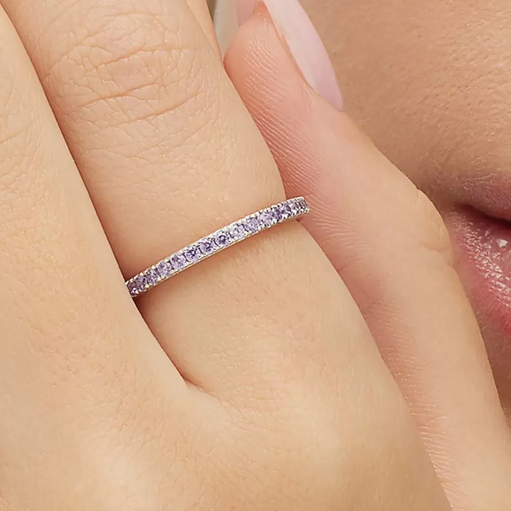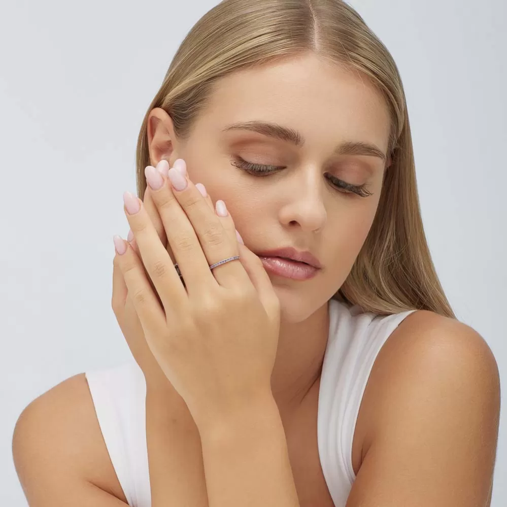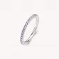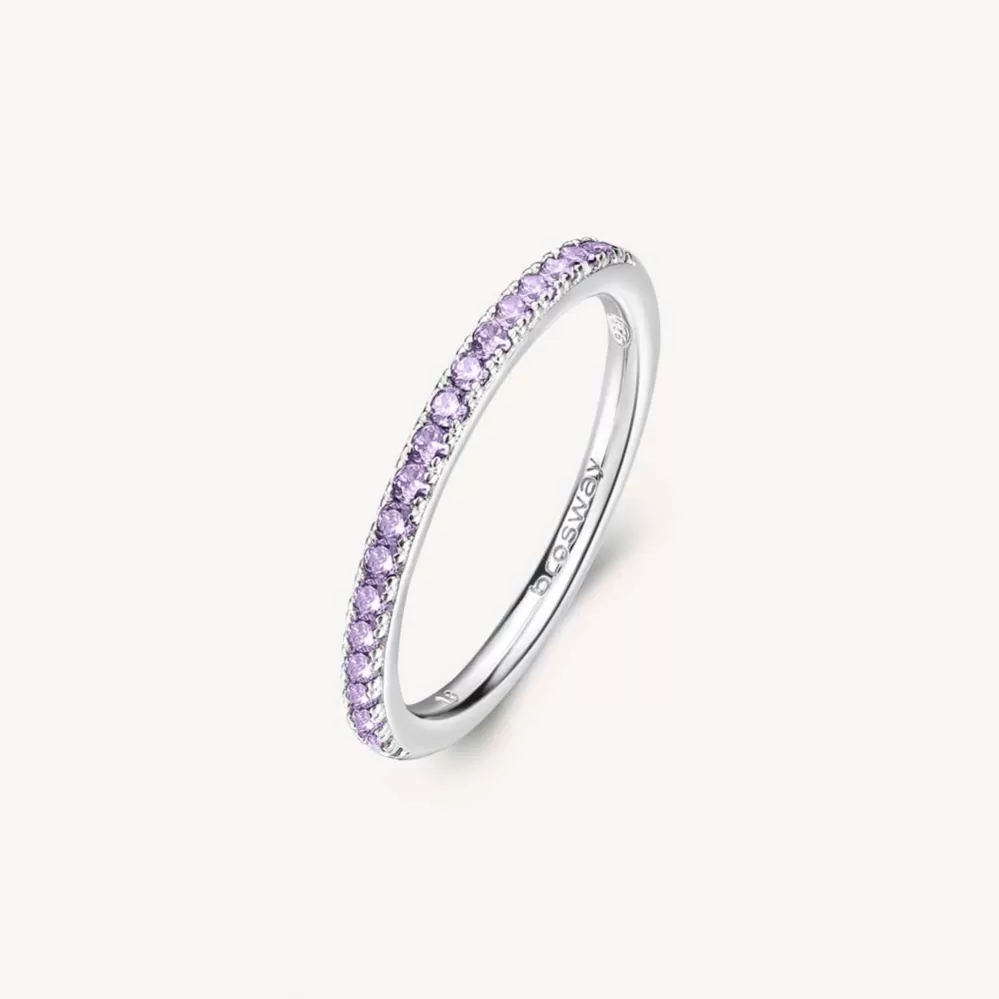 Decentný, dámsky prsteň je vyrobený zo striebra rýdzosti 925/1000, ktoré je zušľachtené rhodiovaním.. Rhodium je ušľachtilý drahý kov zo skupiny platinových kovov. Rhodiovaním strieborných prsteňov galvanickým nanášaním tohto drahého kovu sa stáva povrch šperku tvrdší, stálejší a odolnejší voči vonkajším vplyvom ako je mechanický oter, poškriabanie, nabiehanie striebra, ľudský pot, kozmetické prípravky a ďalšie. Ródium je antialergické. Strieborný prsteň je zdobený prvotriednymi z zirkónmi, ktoré sú precízne vsadené jeden vedľa druhého.