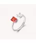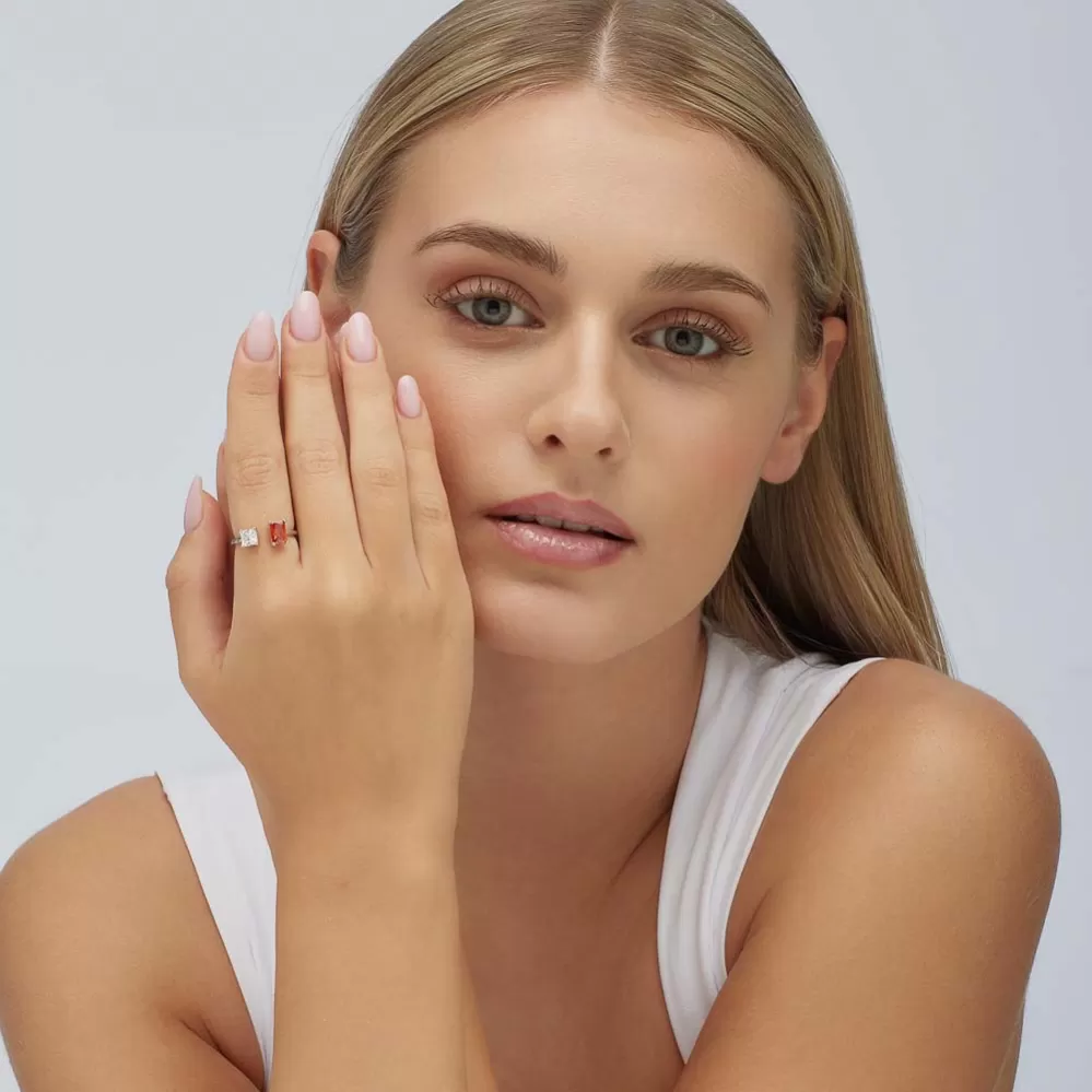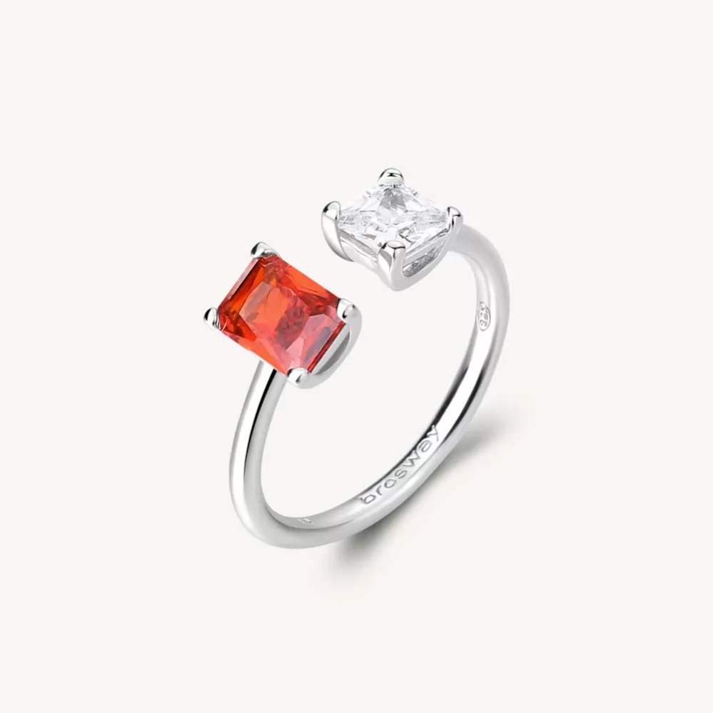 Originálny prsteň je vyrobený zo striebra rýdzosti 925/1000 v lesklej povrchovej úprave. Prsteň je zdobený kubickými zirkónmi v oranžovej a bielej farbe, ktoré sú vsadené po stranách a precízne brúsené do hranatého tvaru. Prsteň je zušľachtený ródiom. Ródium je ušľachtilý drahý kov zo skupiny platinových kovov. Rhodiovaním strieborných prsteňov galvanickým nanášaním tohto drahého kovu sa stáva povrch šperku tvrdší, stálejší a odolnejší voči vonkajším vplyvom ako je mechanický oter, poškriabanie, nabiehanie striebra, ľudský pot, kozmetické prípravky a ďalšie. Ródium je antialergické.