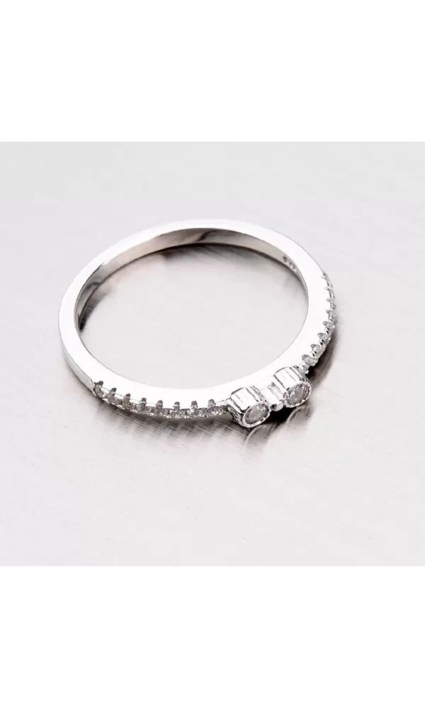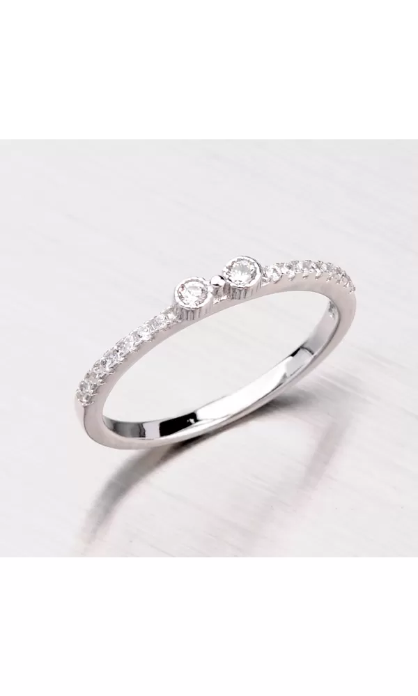 Elegantný dámsky prsteň so zirkónmi vyrobený zo striebra rýdzosti 925/1000 v lesklej povrchovej úprave. Centrálnou ozdobou prsteňa sú dva zirkóny a tie sú potom dekorované menšími zirkónmi po obrúčke prsteňa. Jemný biely lesk strieborného prsteňa je zvýraznený leskom zirkónov.