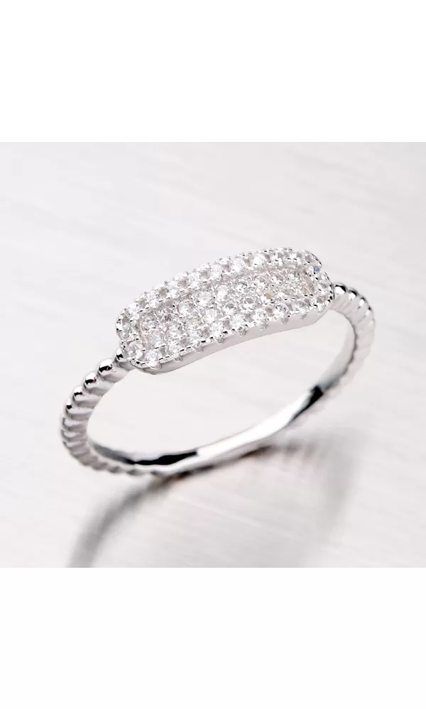 Elegantný dámsky prsteň s bielymi zirkónmi je vyrobený technikou microsetting z rhodiovaného striebra rýdzosti 925/1000.