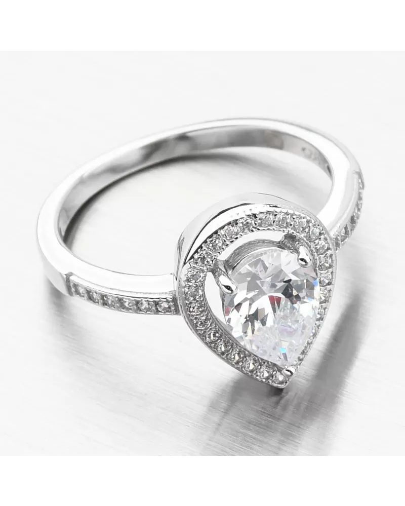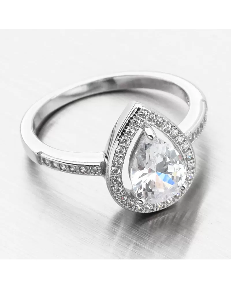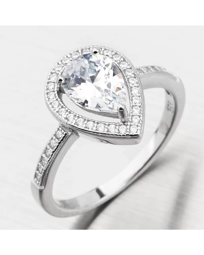 Elegantný prsteň s precíznym osadením žiarivými zirkónmi. Ozdoba prsteňa má hlavný zirkón brúsený do tvaru "Pear" alebo tiež slza či kvapka a tá je potom osadená menšími okrúhlymi zirkónmi v línii okolo hlavného kameňa a potom aj na časti obrúčky v prednej časti. Zirkóny sú v briliantovom bruse, ktorý dodáva maximálnu ligot. Prsteň bude vhodný nielen na nosenie na špeciálne udalosti či do spoločnosti, ale aj na klasické denné nosenie.