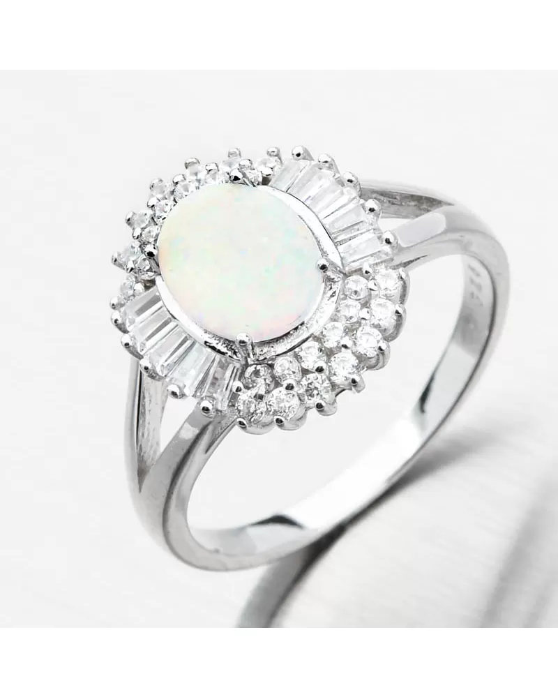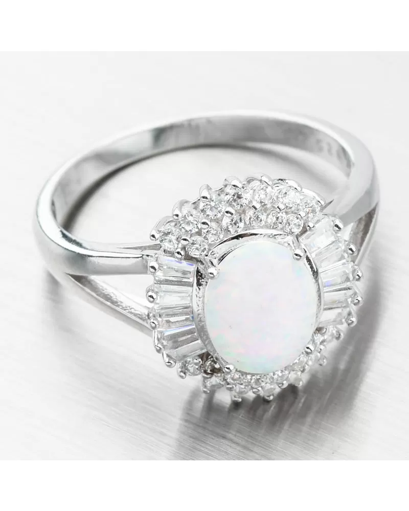 Biely opál Vás pohltí svojou hrou farieb a jedinečnými odleskami, ktorými je tento opál preslávený. Táto farba opálu symbolizuje telesnú a duševnú harmóniu – uvoľňuje stres, obavy či úzkosť. Bude sa hodiť k výrazným farbám a tiež len pre dobrý pocit, aby ste sa cítili veselo a sexy. Opál je syntetický a je oválneho tvaru a okolo neho sú drobné zirkóny vybrúsené do obdĺžnikového brusu a tiež okrúhleho briliantového brusu, ktorý zaisťuje maximálnu brilanciu vybrúsených facet, dokonale odráža svetlo a neuveriteľne žiari z každého uhla pohľadu. Prsteň je aj napriek svojej veľkosti veľmi ľahký a bude maximálne pohodlný na celodenné nosenie. Obrúčka je pri ozdobe rozdvojená a potom sa spája do jednej, vyzerá to elegantne a výrazne.