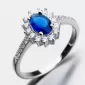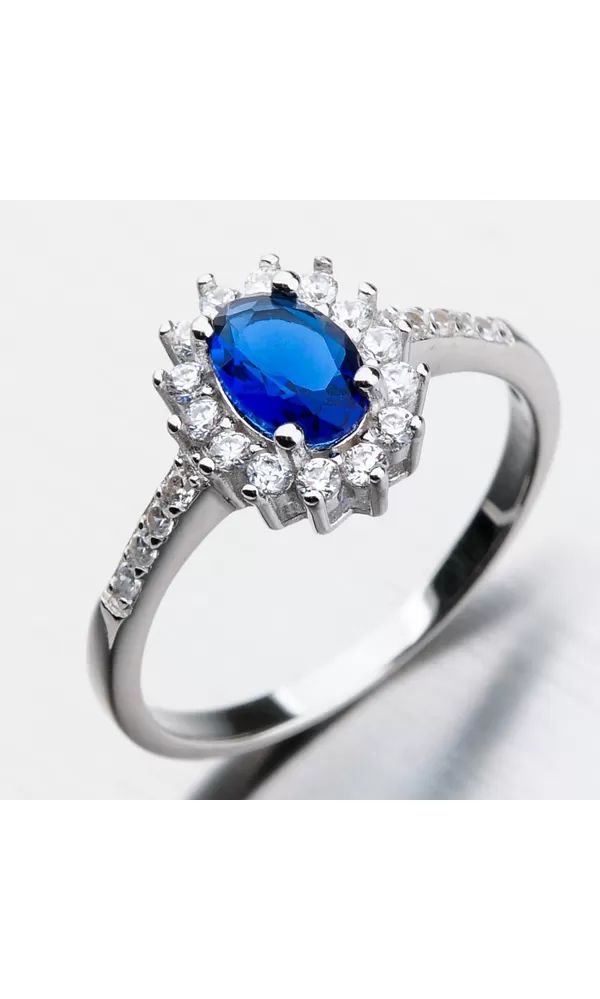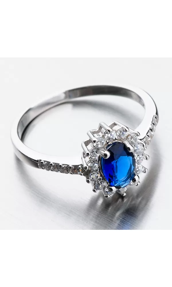 Romantický prsteň, ktorý vo vás vzbudí emócie. To je práve to, čo každá žena chce. Zabodujte týmto skvostným prsteňom. Dominantou prsteňa je korunka, ktorá sa môže pýšiť veľkým oválnym syntetickým zafírom, ktorého precízny brús spôsobí dokonalé odlesky facet. Okolo zafíru sú starostlivo vsadené malé zirkóny v briliantovom bruse. Zirkóny nájdete aj na obrúčke. Čo pri tomto modeli strieborného prsteňa oceníte je zosilnená obrúčka.