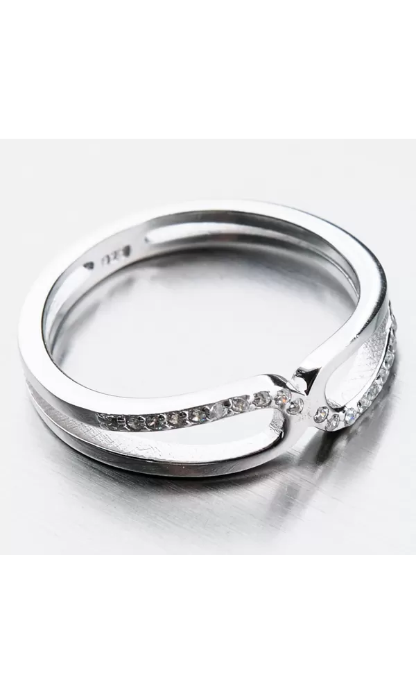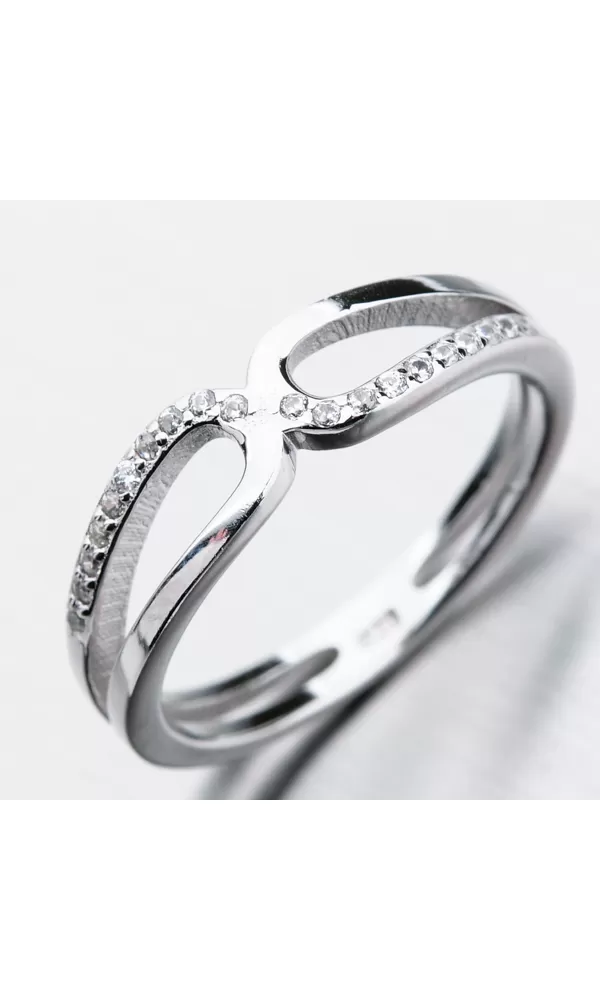 Nápaditý prsteň vyzerá na prvý ako keby bol rozdelený na dve časti, ktoré sú uprostred spojené letovaním. Jednu časť linky zdobia starostlivo vsadené zirkóny v briliantovom bruse. Tento precízny brús prepožičiava zirkónu neuveriteľný lesk.