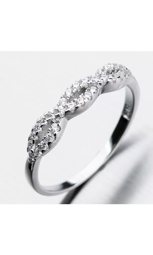 Jemný zdobený prsteň nadchne ženy čo milujú žiaru zirkónov. Zirkóny sú vsadené do dvoch vlniek jeden vedľa druhého. Žiarivé zirkóny sú v briliantovom bruse. Strieborný prsteň pôsobí na prste veľmi príjemne. Je vhodný ako darček.