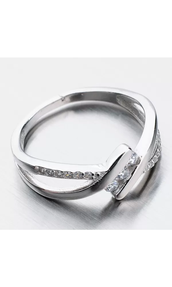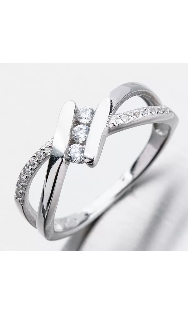 Zaujímavý prsteň upúta vašu pozornosť neobvyklým dizajnom. Prsteň je zdobený zirkónmi v briliantovom bruse. Sú starostlivo vsadené v obrúčke a tiež spájajú prsteň uprostred. Prsteň je vhodný na každodenné nosenie.