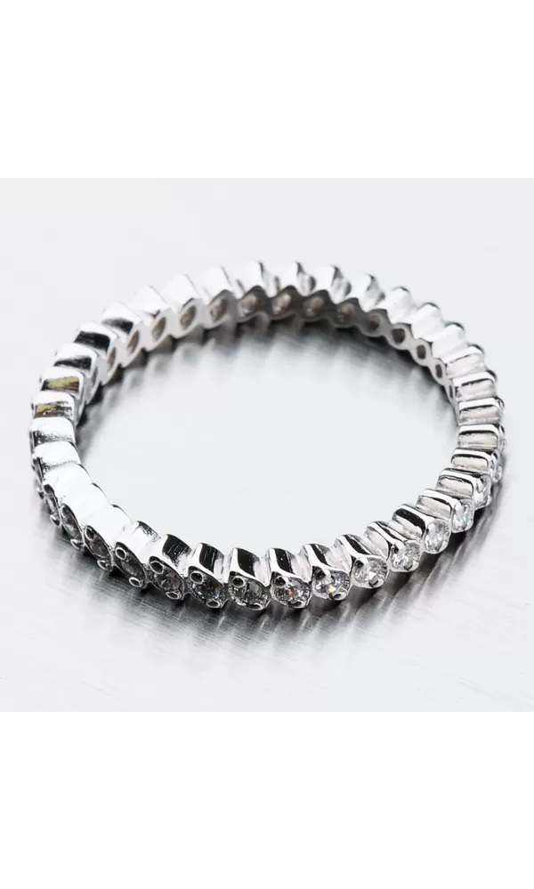 Jemný ale veľmi efektný prsteň si obľúbia ženy aj dievčatá. Jeho dizajn je v jednoduchom dizajne, ktorý je zaujímavý usadením zirkónov. Zirkóny sú v briliantovom v bruse, ktorý dodáva zirkónom brilanciu pravých diamantov. Prsteň sa dá nosiť samostatne ale veľmi trendy je ho nakombinovať s ešte iným prsteňom, ktorý môže byť nad ním. Oboje varianty sú veľmi atraktívne.