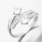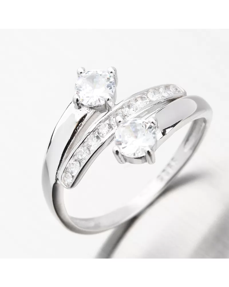 Máte rada výrazné šperky? Tento prsteň je priam skvostný. Vyniká na ňom unikátna ozdoba, obrúčka je rozdvojená a konce sa nepretínajú. Na koncoch sú výrazné zirkóny o veľkosti 4 mm. Medzi týmito koncami je línia vodorovná, ktorá je plne osadená zirkónmi. Táto línia je len v prednej časti. Zirkóny sú okrúhleho briliantového brusu, ktorý zaisťuje maximálnu brilanciu vybrúsených facet, dokonale odráža svetlo a neuveriteľne žiari z každého uhla pohľadu. Prsteň má príjemnú váhu, ktorá zaistí pohodlné nosenie po celý deň.
