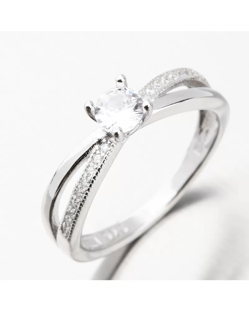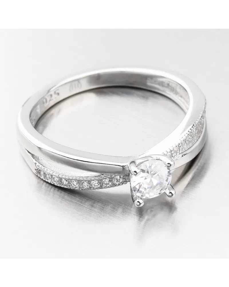Originálny strieborný prsteň, ktorý si zamilujete. Prsteň má v prednej časti rozdvojenú obrúčku a tá vedie k samotnému stredu prsteňa, ktorý je osadený výrazným zirkónom o veľkosti 4,50 mm. Ten je usadený pomocou štyroch krapien a tie zaistia jeho maximálnu bezpečnosť. Aby bol prsteň o to žiarivejší, sú drobné zirkóny vsadené aj na časti prepletených línií. Zirkóny sú okrúhleho briliantového brusu, ktorý zaisťuje maximálnu brilanciu vybrúsených facet, dokonale odráža svetlo a neuveriteľne žiari z každého uhla pohľadu. Prsteň má príjemnú váhu, ktorá zaistí pohodlné nosenie po celý deň.
