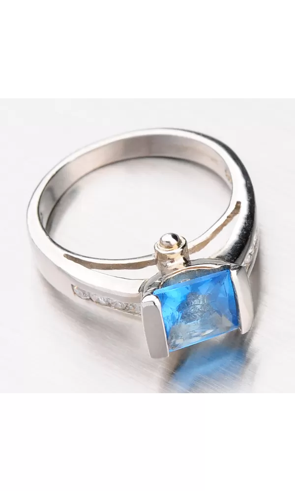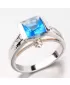 Dámsky rhodiovaný prsteň s veľkým modrým zirkónom, doplneným z každej strany 4 menšími bielymi zirkónmi, je vyrobený zo striebra rýdzosti 925/1000. Prsteň je v lesklej povrchovej úprave s rhodiovaním.