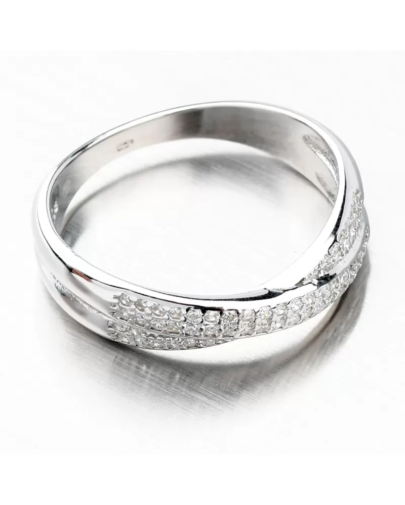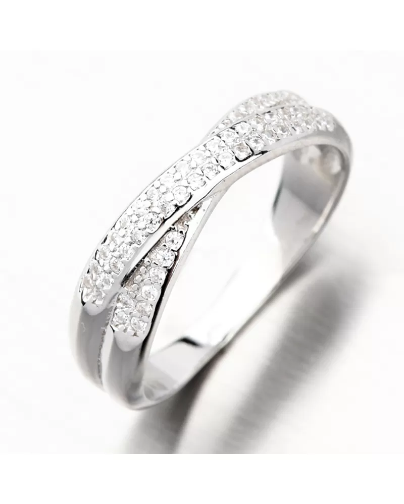 Elegantný prepletený prsteň vhodný pre všetky príležitosti. Prsteň je na prednej časti osadený nádhernými zirkónmi v dvoch radoch. Zirkóny nevyčnievajú a vy sa tak nemusíte báť, že by ste s prsteňom kdekoľvek zatrhli alebo vy vám prekážali. Zirkóny sú okrúhleho briliantového brusu, ktorý zaisťuje maximálnu brilanciu vybrúsených facet, dokonale odráža svetlo a neuveriteľne žiari z každého uhla pohľadu. Prsteň má príjemnú váhu, ktorá zaistí pohodlné nosenie po celý deň.