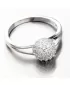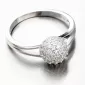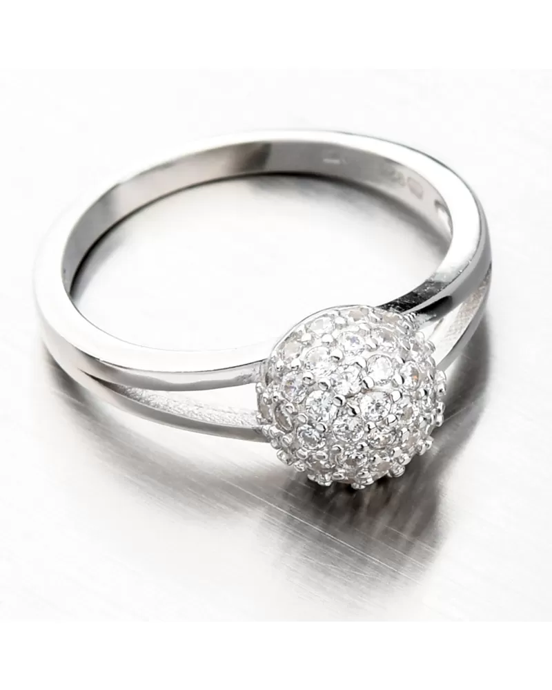 Originálny strieborný prsteň, ktorý len tak niekde neuvidíte. Spracovanie prsteňa je do najmenšieho detailu. Prsteň má v prednej časti rozdvojenú obrúčku a spoločne z oboch strán vedie k hlavnej ozdobe vo forme trblietavej guľôčky osadenej zirkónmi. Zirkóny sú okrúhleho briliantového brusu, ktorý zaisťuje maximálnu brilanciu vybrúsených facet, dokonale odráža svetlo a neuveriteľne žiari z každého uhla pohľadu. Prsteň má príjemnú váhu, ktorá zaistí pohodlné nosenie po celý deň.