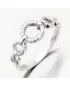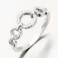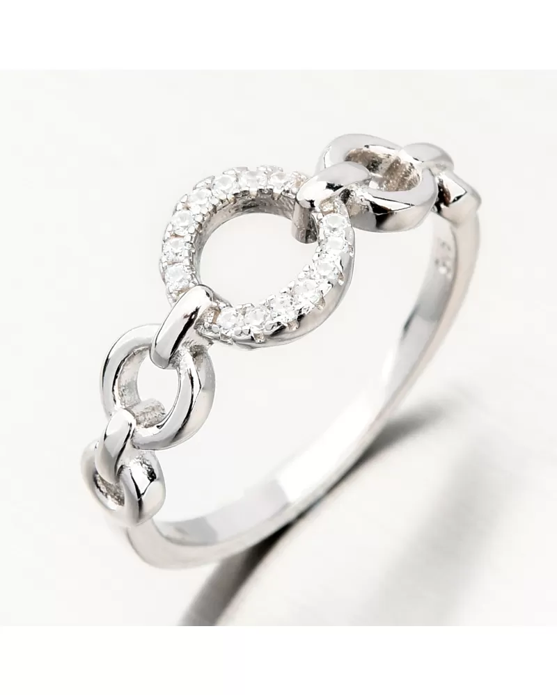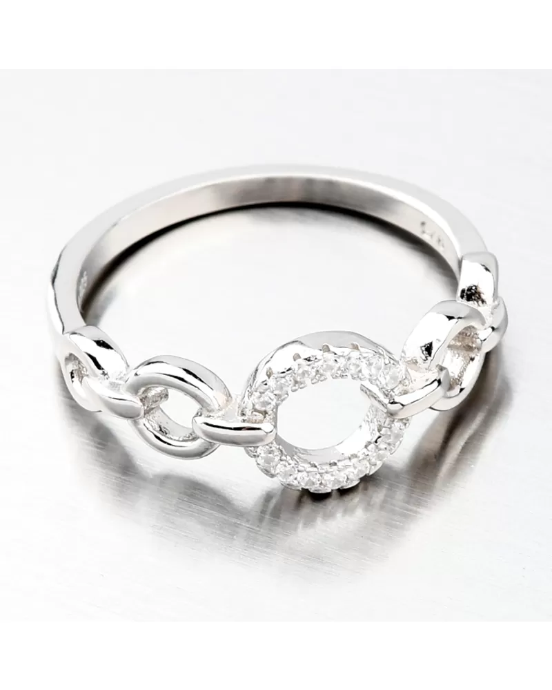Veľmi elegantný strieborný prsteň stvorený na všetky udalosti. Zaiste vás zaujme prevedenie prsteňa, kedy je ozdoba prsteňa tvorená z prepletených koliesok a stredové koliesko, ktoré je súčasne najväčšie, je po celom obvode osadené trblietavými zirkónmi. Zirkóny sú okrúhleho briliantového brusu, ktorý zaisťuje maximálnu brilanciu vybrúsených facet, dokonale odráža svetlo a neuveriteľne žiari z každého uhla pohľadu. Prsteň má príjemnú váhu, ktorá zaistí pohodlné nosenie po celý deň. Súčasne je výška prsteňa natoľko príjemná, že nehrozí žiadne zatrhnutie prsteňa napríklad o oblečení.