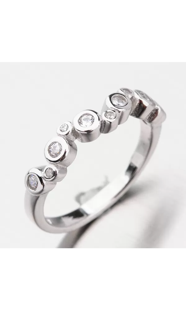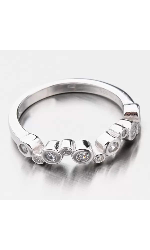 Zaujímavý prsteň je zdobený guličkami, ktoré pripomínajú bublinky. Bublinky nie sú pravidelne poskladané a líšia sa veľkosťou. Zvýraznené sú zirkóny v briliantovom bruse. Týmto brusom získavajú brilanciu pravých diamantov.