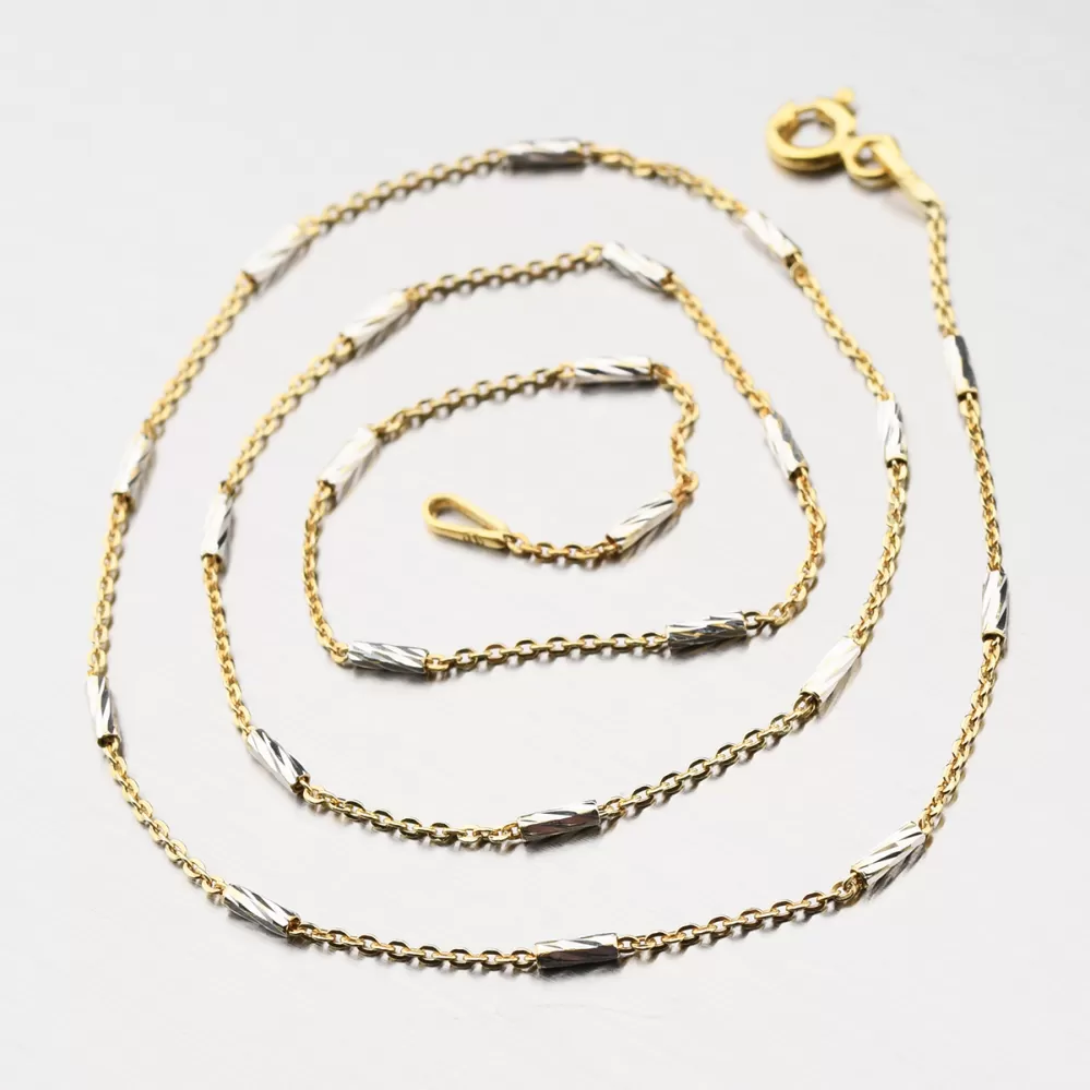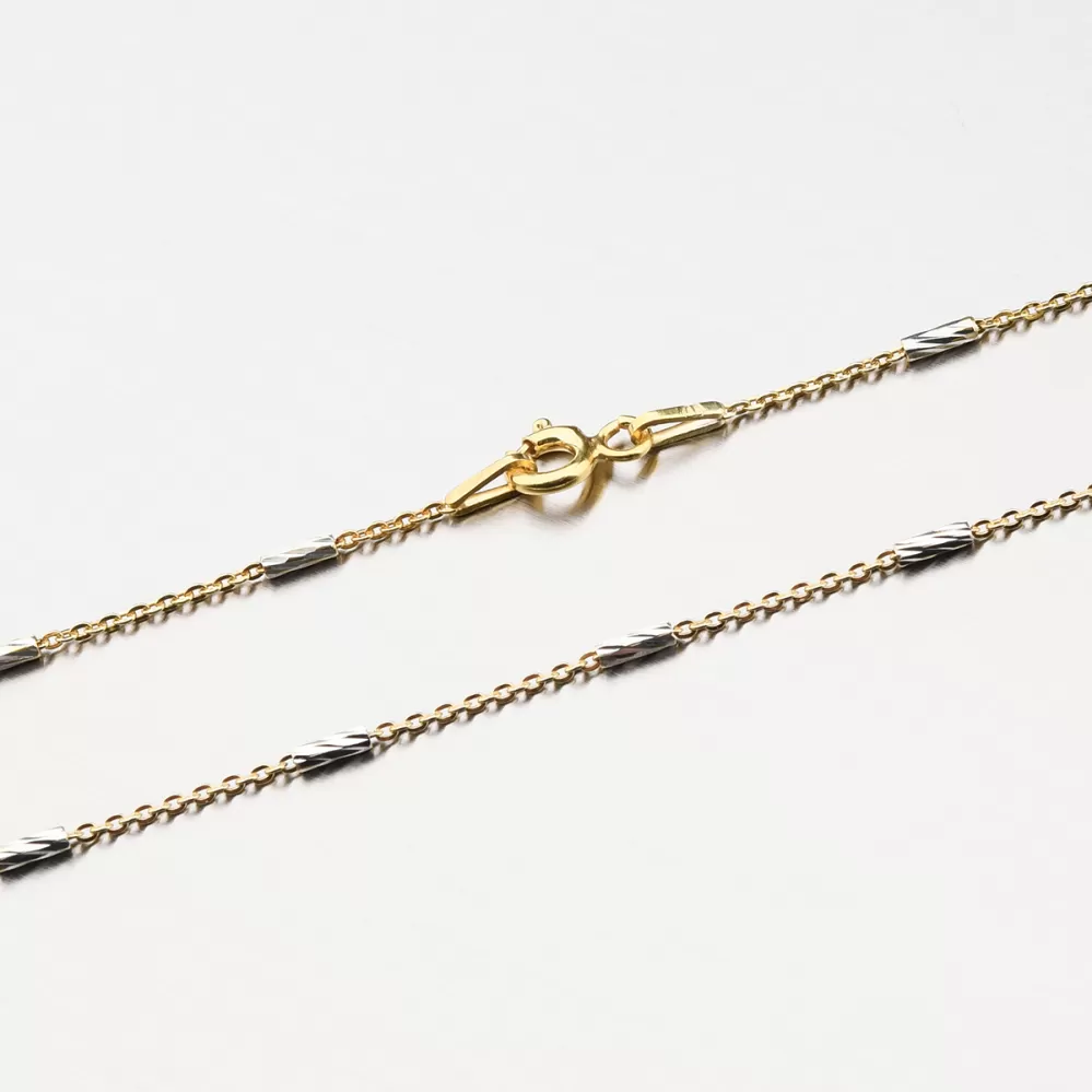 Retiazka je tvorená z obľúbenej retiazky Anker, ktorá je známa svojou pevnosťou a leskom.Na retiazke môžeme vidieť na seba nadväzujúce valčeky, ktoré sú povrchovo upravené facetami. Facety sú robené pomocou diamantového nástroja a vďaka ich lesklému povrchu odrážajú svetlo a šperk sa tak stáva super lesklým zo všetkých uhlov.