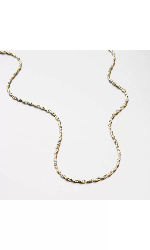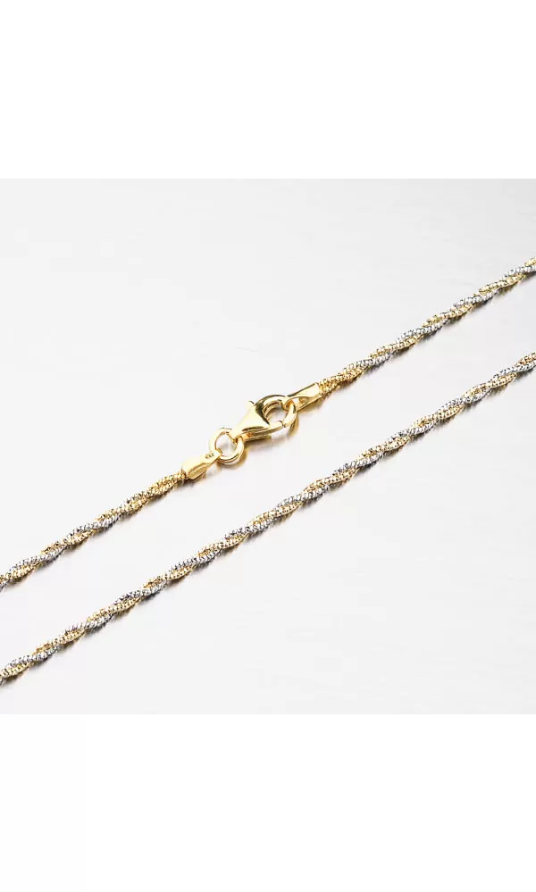 Chcete upútať decentným ale žiarivým šperkom? Tento náhrdelník je zložené z dvoch retiazok, ktoré sú do seba zapletené. Retiazky sa od seba líšia tým, že jeden z nich je zdobený pozlátením PVD v žltej farbe zlata. Aj napriek tomu svoju drobnosť je náhrdelník pevný a veľmi prispôsobivý. Dámsky náhrdelník je vyrobený zo striebra o rýdzosti 925/1000 v lesklej povrchovej úprave.