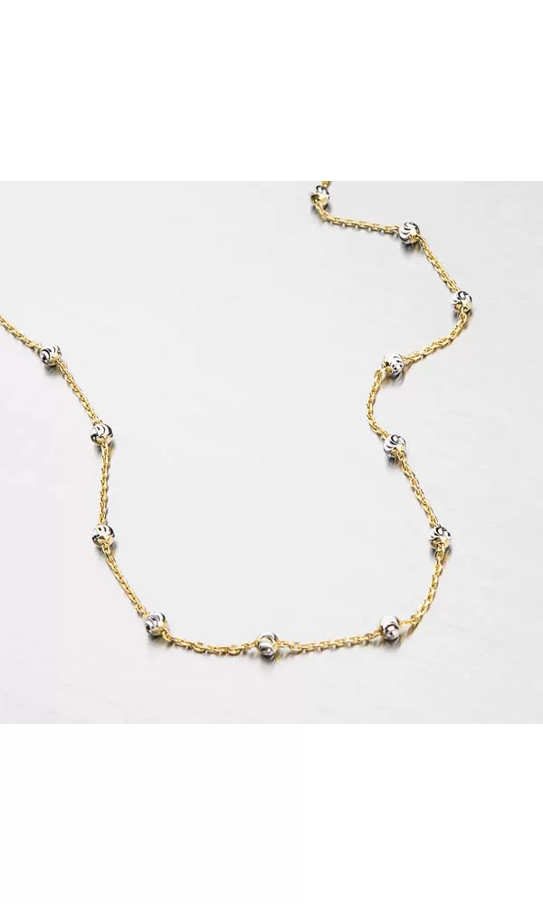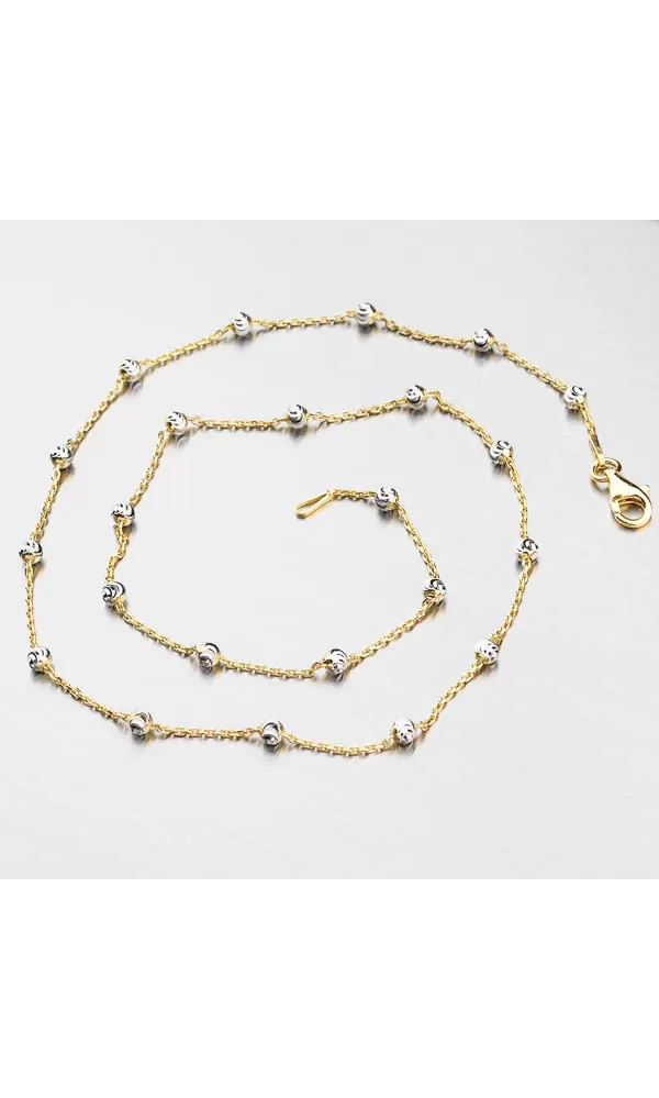 Jemná a zdobená dámska retiazka vám dokonale ozdobí dekolt. Retiazka je zložená z klasickej retiazky a prívesky vo forme guličiek, ktoré sa pravidelne opakujú. Retiazka je upravená technikou zlatenia PVD, ktorá dodá retiazku odolnosť a farbu žltého zlata. Guličky sú zvýraznené gravírovaním, ktoré im dodáva lesk. Dámska retiazka je vyrobená zo striebra o rýdzosti 925/1000 v lesklej povrchovej úprave.