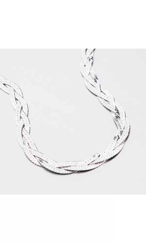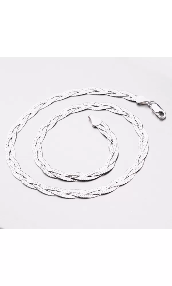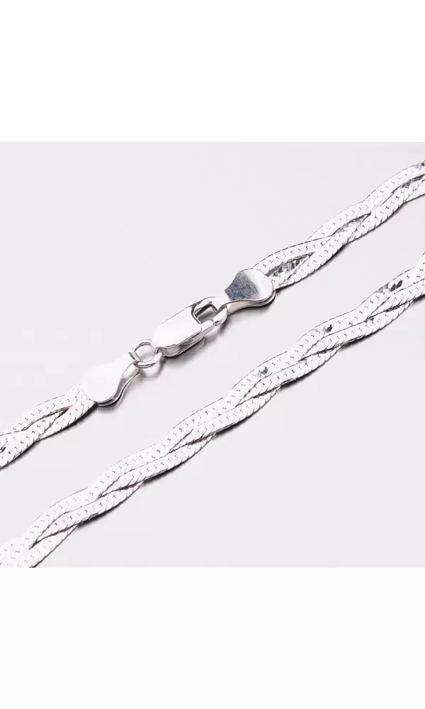 Buďte elegantný s týmto náhrdelníkom a oslňte okolie. Náhrdelník je zložený z troch plochých retiazok, ktoré sú do seba spletené a tvoria tak vrkoč. Každá z retiazok má facetovaný povrch - lesklé plôšky, ktoré sú zhotovené diamantovým nástrojom, ktorý dodáva vzniknutým facetám maximálny lesk, vďaka ktorému dokonale odráža svetlo a majú krásnu brilanciu zo všetkých uhlov pohľadu!  Svojím prevedení náhrdelník krásne priľne a ozdobí váš dekolt. Je pevný a neprehliadnuteľný. Dámsky náhrdelník je vyrobený zo striebra o rýdzosti 925/1000 v lesklej povrchovej úprave s rhodiovaním. Ródium je ušľachtilý drahý kov zo skupiny platinových kovov. Rhodiovaním strieborných šperkov galvanickým nanášaním tohto drahého kovu sa stáva povrch šperku tvrdší, stálejší a odolnejší voči vonkajším vplyvom ako je mechanický oter, poškriabanie, nabiehanie striebra, ľudský pot, kozmetické prípravky a ďalšie. Ródium je antialergické.  Strieborný náhrdelník zapnete karabínou.