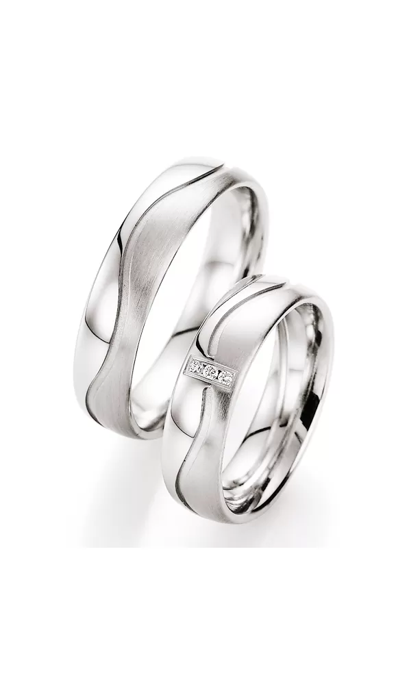 Diamantové snubné prstene moderného dizajnu vyrobené zo striebra rýdzosti 925/1000 polguľatého profilu s kombinovanou povrchovou úpravou lesk - zamatový mat. Na prsteňoch je pieskovaná ryha - vlnovka, ktorá prebieha po celom obvode prsteňov. V dámskom prsteni sú vsadené tri okrúhle diamanty briliantového brusu. Diamanty vynikajú svojou krásou a vlastnosťami, ktoré sú oproti iným kameňom bezkonkurenčné. Je to najtvrdší nerast, ktorý nikdy nestratí svoju hodnotu. Diamant je kráľ všetkých drahokamov a teda aj jedným z najcennejších a preto sa oplatí do šperkov s diamantmi investovať a predovšetkým pri snubných prsteňoch, ktoré sú na celý život! Vsadzovanie diamantov vykonávajú naši najskúsenejší majstri zlatníci ručne pod mikroskopom s presnosťou na 0,01 mm a preto nehrozí vypadnutie kamienkov ako to býva u strojne vyrábaných snubných prsteňov. Snubné prstene majú vnútorný fit profil - zaoblenie vnútornej strany prsteňov pre príjemnejšie nosenie, nasadzovanie a odnímanie prsteňov.