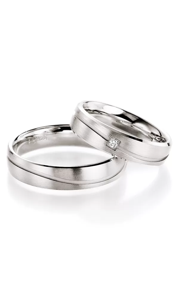 Elegantné snubné prstene zo striebra rýdzosti 925/1000 s diamantom vo veľmi miernom polguľatom profile s matnou povrchgovou úpravou zamatový mat. V prsteňoch je zhotovená úzka vlnovka po celom obvode, ktorá je zvýraznená pieskovaním, na oboch krajoch snubných prsteňov je lesklá faceta. V dámskom prsteni je vsadený do štvorčeka, ktorý je tiež pieskovaný jeden okrúhly diamant briliantového brusu. Diamanty vynikajú svojou krásou a vlastnosťami, ktoré sú oproti iným kameňom bezkonkurenčné. Je to najtvrdší nerast, ktorý nikdy nestratí svoju hodnotu. Diamant je kráľ všetkých drahokamov a teda aj jedným z najcennejších a preto sa oplatí do šperkov s diamantmi investovať a predovšetkým pri snubných prsteňoch, ktoré sú na celý život! Vsadzovanie diamantov vykonávajú naši najskúsenejší majstri zlatníci ručne pod mikroskopom s presnosťou na 0,01 mm a preto nehrozí vypadnutie kamienkov ako to býva u strojne vyrábaných snubných prsteňov. Snubné prstene majú vnútorný fit profil - zaoblenie vnútornej strany prsteňov pre príjemnejšie nosenie, nasadzovanie a odnímanie prsteňov.