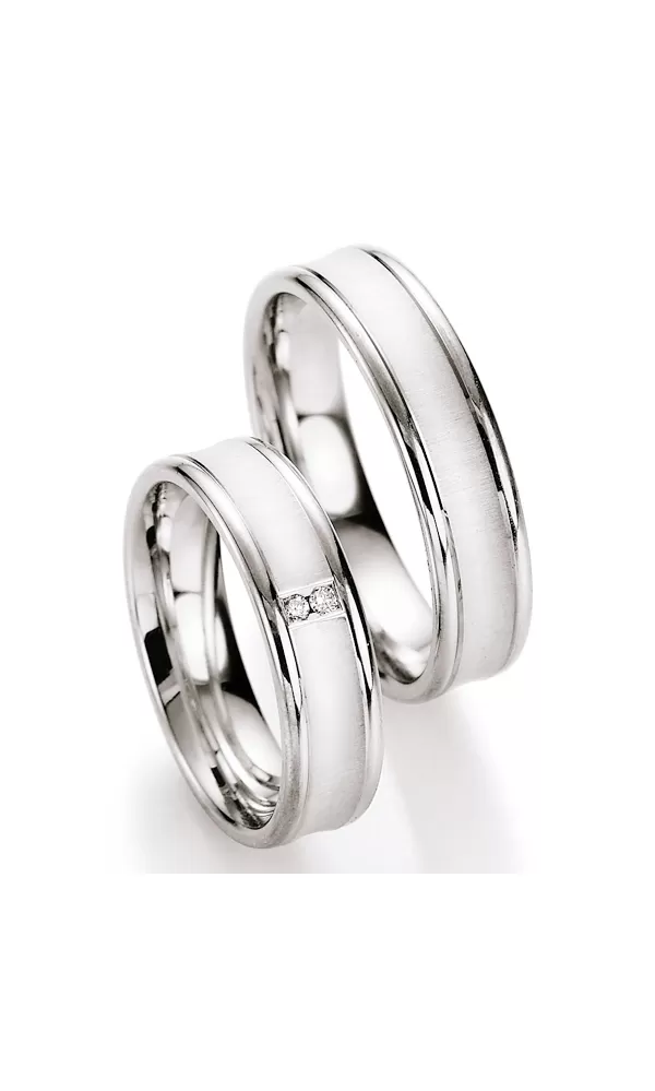 Moderné strieborné snubné prstene s diamantom konkávneho profilu s kombinovanou povrchovou úpravou zamatovo matná stredná časť prehnutá do žliabku (konkávny profil) s lesklými polguľatými okrajmi. Matný stred a lesklé okraje sú oddelené a zvýraznené lesklými ryhami. V dámskom prsteni sú vsadené dve okrúhle diamanty briliantového brusu. Diamanty vynikajú svojou krásou a vlastnosťami, ktoré sú oproti iným kameňom bezkonkurenčné. Je to najtvrdší nerast, ktorý nikdy nestratí svoju hodnotu. Diamant je kráľ všetkých drahokamov a teda aj jedným z najcennejších a preto sa oplatí do šperkov s diamantmi investovať a predovšetkým pri snubných prsteňoch, ktoré sú na celý život! Vsadzovanie diamantov vykonávajú naši najskúsenejší majstri zlatníci ručne pod mikroskopom s presnosťou na 0,01 mm a preto nehrozí vypadnutie kamienkov ako to býva u strojne vyrábaných snubných prsteňov. Snubné prstene majú vnútorný fit profil - zaoblenie vnútornej strany prsteňov pre príjemnejšie nosenie, nasadzovanie a odnímanie prsteňov.