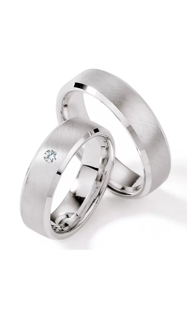 Snubné prstene zo striebra s diamantom v rovnom profile so zamatovo matnou povrchovou úpravou a lesklými šikmými prúžkami po stranách. V dámskom prsteni je vsadený jeden okrúhly diamant briliantového brusu.  Diamanty vynikajú svojou krásou a vlastnosťami, ktoré sú oproti iným kameňom bezkonkurenčné. Je to najtvrdší nerast, ktorý nikdy nestratí svoju hodnotu. Diamant je kráľ všetkých drahokamov a teda aj jedným z najcennejších a preto sa oplatí do šperkov s diamantmi investovať a predovšetkým pri snubných prsteňoch, ktoré sú na celý život!  Vsadzovanie diamantov vykonávajú naši najskúsenejší majstri zlatníci ručne pod mikroskopom s presnosťou na 0,01 mm a preto nehrozí vypadnutie kamienkov ako to býva u strojne vyrábaných snubných prsteňov. Snubné prstene majú vnútorný fit profil - zaoblenie vnútornej strany prsteňov pre príjemnejšie nosenie, nasadzovanie a odnímanie prsteňov.