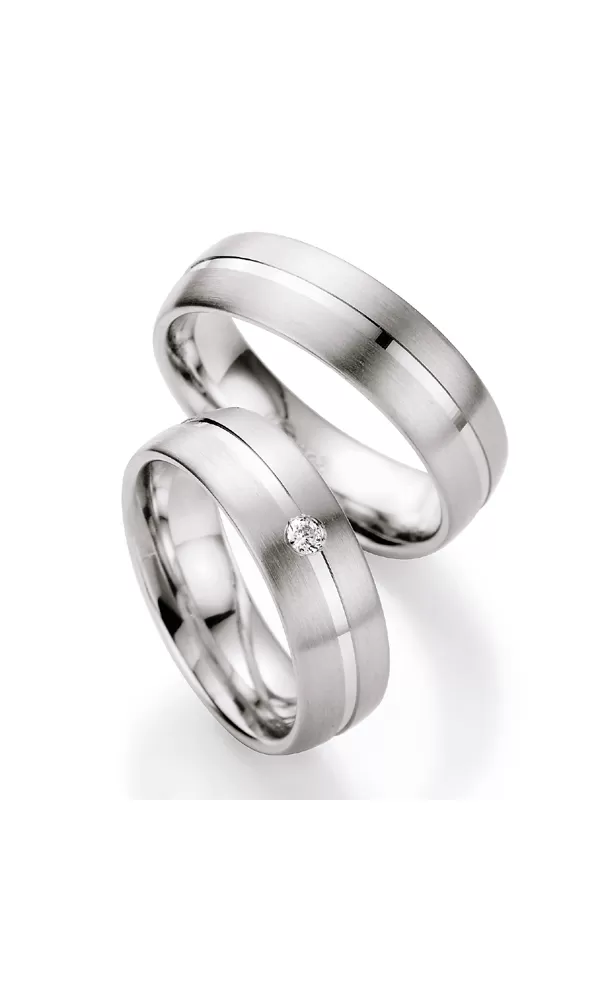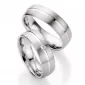 Strieborné snubné prstene s diamantom v pologuľatom profile s matnou povrchovou úpravou a lesklým zapusteným prúžkom. V dámskom prsteni je vsadený… Celý popis