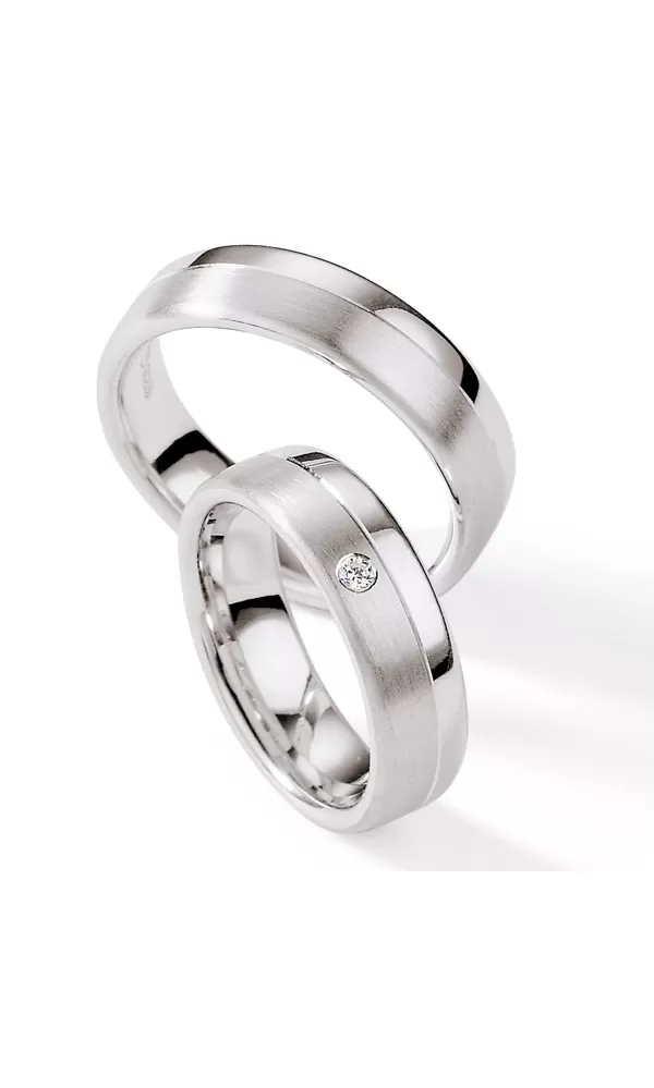 Strieborné snubné prstene s diamantom v pologuľatom profile s kombinovanou povrchovou úpravou zamatový mat - lesk, ktorý je rozdelený jemnou ryhou. V dámskom prsteni je vsadený jeden okrúhly diamant briliantového brusu.  Diamanty vynikajú svojou krásou a vlastnosťami, ktoré sú oproti iným kameňom bezkonkurenčné. Je to najtvrdší nerast, ktorý nikdy nestratí svoju hodnotu. Diamant je kráľ všetkých drahokamov a teda aj jedným z najcennejších a preto sa oplatí do šperkov s diamantmi investovať a predovšetkým pri snubných prsteňoch, ktoré sú na celý život!  Vsadzovanie diamantov vykonávajú naši najskúsenejší majstri zlatníci ručne pod mikroskopom s presnosťou na 0,01 mm a preto nehrozí vypadnutie kamienkov ako to býva u strojne vyrábaných snubných prsteňov. Snubné prstene majú vnútorný fit profil - zaoblenie vnútornej strany prsteňov pre príjemnejšie nosenie, nasadzovanie a odnímanie prsteňov.