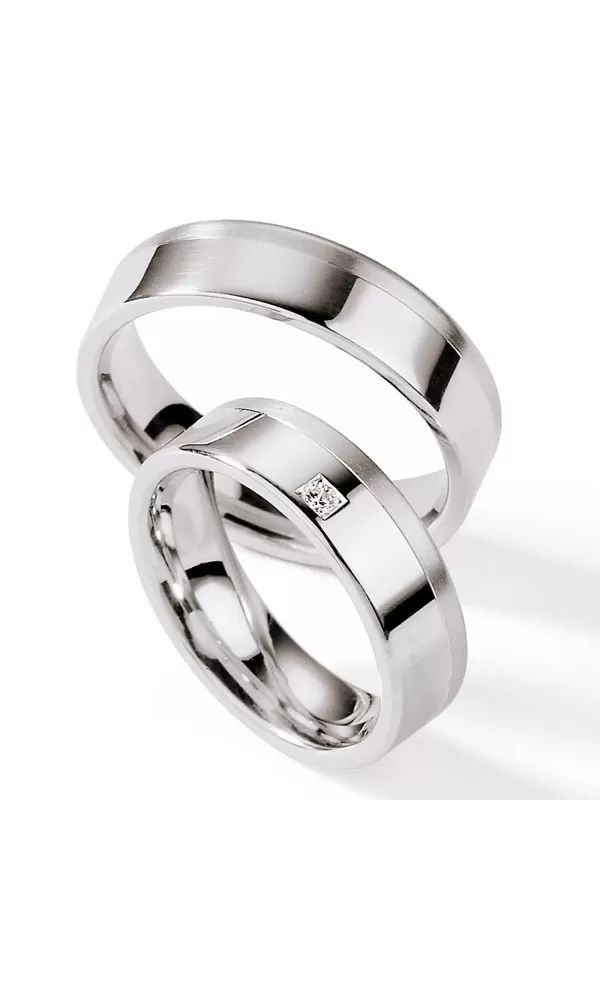 Strieborné snubné prstene s diamantom vyrobené v rovnom profile s kombinovanou povrchovou úpravou zamatový mat - lesk, ktorý je rozdelený jemnou ryhou. V dámskom prsteni je vsadený jeden okrúhly diamant do štvorčeka, briliantového brusu. Diamanty vynikajú svojou krásou a vlastnosťami, ktoré sú oproti iným kameňom bezkonkurenčné. Je to najtvrdší nerast, ktorý nikdy nestratí svoju hodnotu. Diamant je kráľ všetkých drahokamov a teda aj jedným z najcennejších a preto sa oplatí do šperkov s diamantmi investovať a predovšetkým pri snubných prsteňoch, ktoré sú na celý život! Vsadzovanie diamantov vykonávajú naši najskúsenejší majstri zlatníci ručne pod mikroskopom s presnosťou na 0,01 mm a preto nehrozí vypadnutie kamienkov ako to býva u strojne vyrábaných snubných prsteňov. Snubné prstene majú vnútorný fit profil - zaoblenie vnútornej strany prsteňov pre príjemnejšie nosenie, nasadzovanie a odnímanie prsteňov.