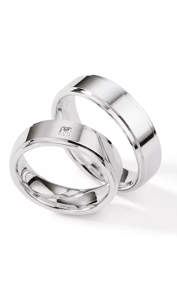 Snubné prstene zo striebra s diamantom rovného profilu s lesklou povrchovou úpravou. V dámskom prsteni je vsadený jeden okrúhly diamant briliantového brusu. Snubné prstene majú vnútorný fit profil - zaoblenie vnútornej strany prsteňov.  Diamanty vynikajú svojou krásou a vlastnosťami, ktoré sú oproti iným kameňom bezkonkurenčné. Je to najtvrdší nerast, ktorý nikdy nestratí svoju hodnotu. Diamant je kráľ všetkých drahokamov a teda aj jedným z najcennejších a preto sa oplatí do šperkov s diamantmi investovať a predovšetkým pri snubných prsteňoch, ktoré sú na celý život!  Vsadzovanie diamantov vykonávajú naši najskúsenejší majstri zlatníci ručne pod mikroskopom s presnosťou na 0,01 mm a preto nehrozí vypadnutie kamienkov ako to býva u strojne vyrábaných snubných prsteňov. Snubné prstene majú vnútorný fit profil - zaoblenie vnútornej strany prsteňov pre príjemnejšie nosenie, nasadzovanie a odnímanie prsteňov.