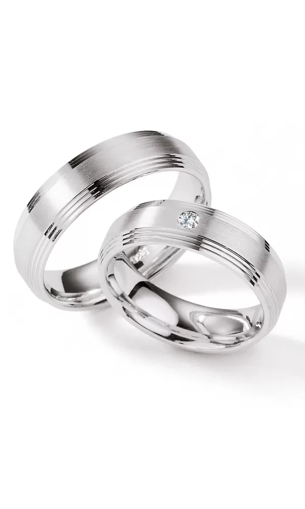 Snubné prstene zo striebra 925/000 s diamantom v pologuľatom profile s matnou povrchovou úpravou a lesklými ryhami po krajoch. V dámskom prsteni je vsadený jeden okrúhly diamant briliantového brusu. Diamanty vynikajú svojou krásou a vlastnosťami, ktoré sú oproti iným kameňom bezkonkurenčné. Je to najtvrdší nerast, ktorý nikdy nestratí svoju hodnotu. Diamant je kráľ všetkých drahokamov a teda aj jedným z najcennejších a preto sa oplatí do šperkov s diamantmi investovať a predovšetkým pri snubných prsteňoch, ktoré sú na celý život! Vsadzovanie diamantov vykonávajú naši najskúsenejší majstri zlatníci ručne pod mikroskopom s presnosťou na 0,01 mm a preto nehrozí vypadnutie kamienkov ako to býva u strojne vyrábaných snubných prsteňov. Snubné prstene majú vnútorný fit profil - zaoblenie vnútornej strany prsteňov pre príjemnejšie nosenie, nasadzovanie a odnímanie prsteňov.