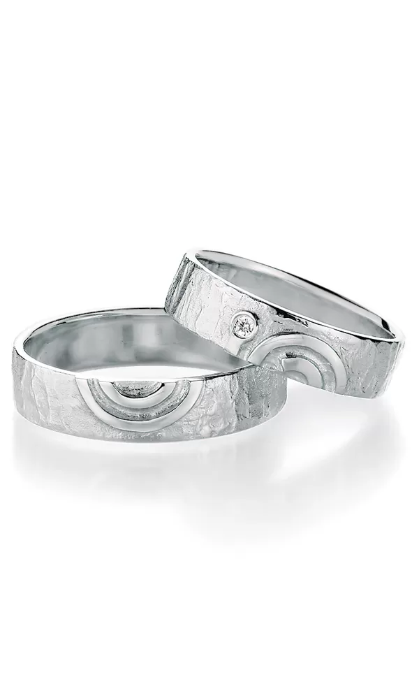 Netradičné snubné prstene moderného dizajnu sú vyrobené zo striebra rýdzosti 925/1000 polguľatého profilu s kombinovanou povrchovou úpravou. Prstene sú matné s zľaklými symbolmi. V dámskom prsteni je vsadený jeden okrúhly diamant briliantového brusu. Diamanty vynikajú svojou krásou a vlastnosťami, ktoré sú oproti iným kameňom bezkonkurenčné. Je to najtvrdší nerast, ktorý nikdy nestratí svoju hodnotu. Diamant je kráľ všetkých drahokamov a teda aj jedným z najcennejších a preto sa oplatí do šperkov s diamantmi investovať a predovšetkým pri snubných prsteňoch, ktoré sú na celý život!  Vsadzovanie diamantov vykonávajú naši najskúsenejší majstri zlatníci ručne pod mikroskopom s presnosťou na 0,01 mm a preto nehrozí vypadnutie kamienkov ako to býva u strojne vyrábaných snubných prsteňov. Snubné prstene majú vnútorný fit profil - zaoblenie vnútornej strany prsteňov pre príjemnejšie nosenie, nasadzovanie a odnímanie prsteňov.