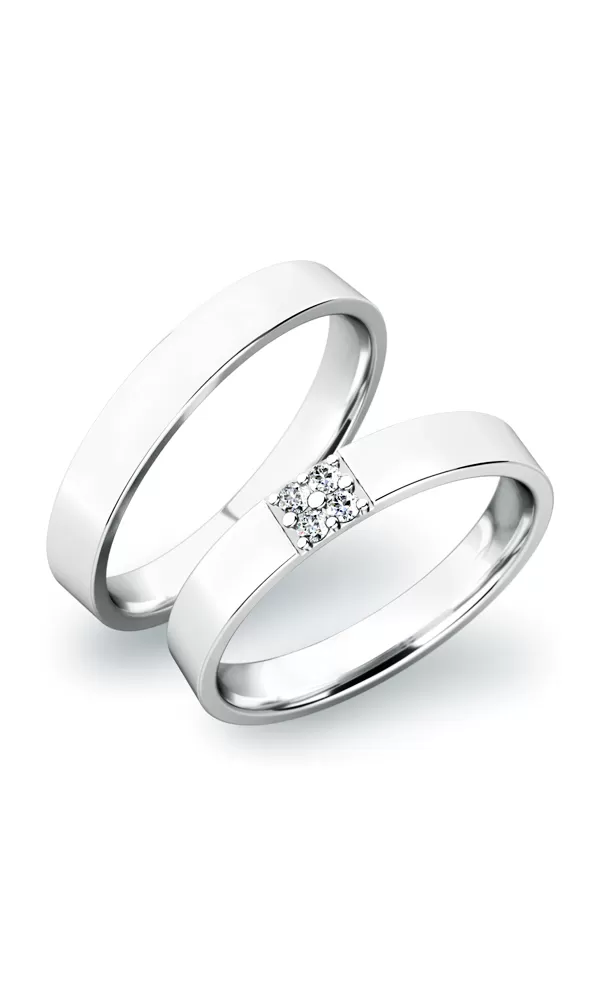 Jemné snubné prstene v rovnom profile sú vyrobené zo striebra rýdzosti 925/1000 v lesklej povrchovej úprave. Snubné prstene majú vnútorné Fit Profil - polguľatú vnútornú stranu pre príjemnejšie nosenie, nasadzovanie a odnímanie. V dámskom prsteni sú vsadené štyri okrúhle zirkóny popr. diamanty briliantového brusu, ktoré sú vsadené do štvorca. Diamanty vynikajú svojou krásou a vlastnosťami, ktoré sú oproti iným kameňom bezkonkurenčné. Je to najtvrdší nerast, ktorý nikdy nestratí svoju hodnotu. Diamant je kráľ všetkých drahokamov a teda aj jedným z najcennejších a preto sa oplatí do šperkov s diamantmi investovať a predovšetkým pri snubných prsteňoch, ktoré sú na celý život! Vsadzovanie zirkónov aj diamantov vykonávajú naši najskúsenejší majstri zlatníci ručne pod mikroskopom s presnosťou na 0,01mm a preto nehrozí vypadnutie kamienkov ako to býva u strojne vyrábaných snubných prsteňov.