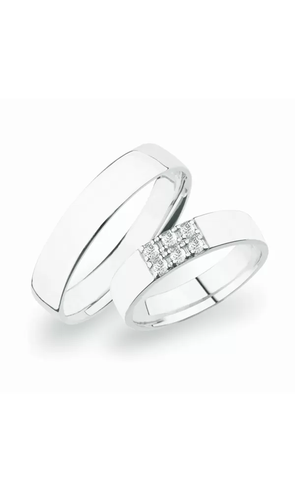 Snubní prsteny z rhodiovaného stříbra ryzosti 925/1000 rovného profilu s lesklou povrchovou úpravou. Snubní prsteny mají vnitřní Fit Profil - půlkulatou vnitřní stranu pro příjemnější nošení, nasazování a sundavání. V dámském prstenu je ve dvou řadách vsazeno šest kulatých zirkonů popř. diamantů briliantového brusu. Snubní prsteny je možné vyrobit v různých povrchových úpravách.