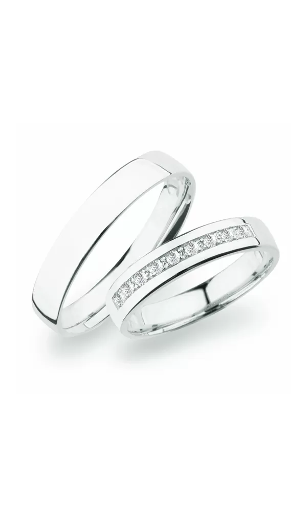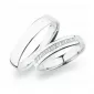 Snubní prsteny z rhodiovaného stříbra ryzosti 925/1000 mírně půlkulatého profilu s lesklou povrchovou úpravou. Snubní prsteny mají vnitřní Fit Profil - půlkulatou vnitřní stranu pro příjemnější nošení, nasazování a sundavání. V dámském prstenu vsazeno devět kulatých zirkonů popř. diamantů briliantového brusu. Snubní prsteny je možné vyrobit v různých šířkách a v různých povrchových úpravách.