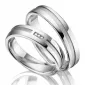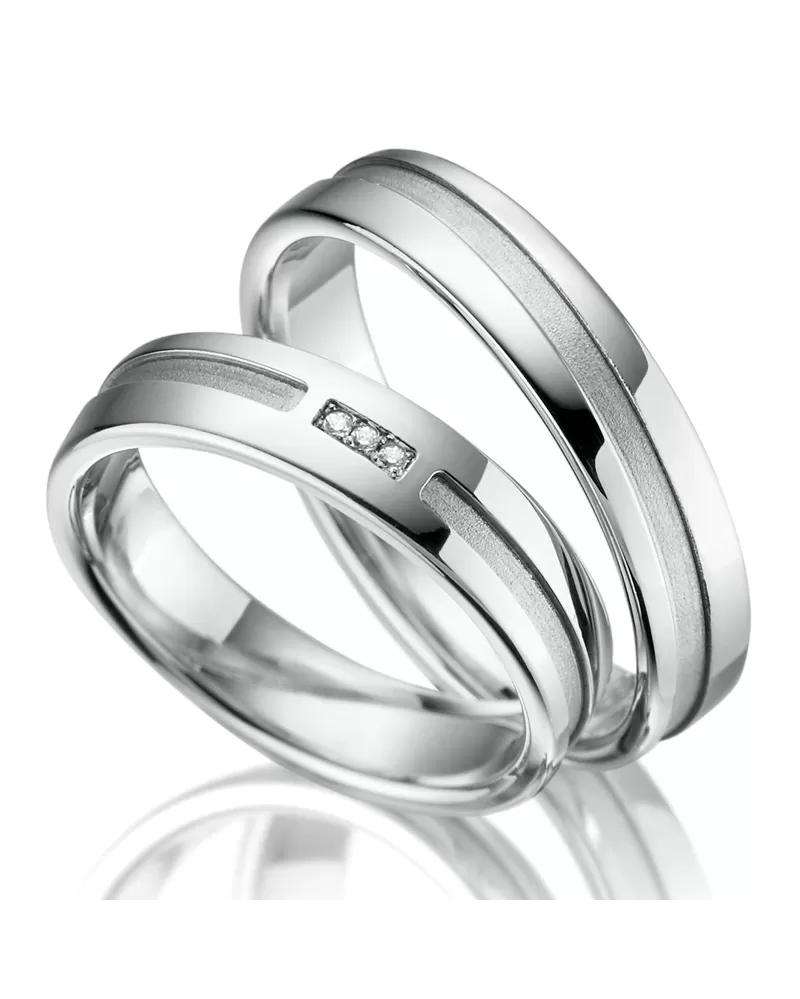 Tyto snubní prsteny zdobí zapuštěný vyfrézovaný proužek, který je zvýrazněn pískováním. Tento proužek kontrastuje s hladkou plochou prstenů, která je leštěná do vysokého lesku. V dámském prstenu jsou vsazeny tři zářivé zirkony těsně u sebe. Zirkony jsou v briliantovém brusu Signity star, který dodává zirkonům maximální brilanci. Vsazování zirkonů provádějí naši nejzkušenější mistři zlatníci ručně pod mikroskopem s přesností na 0,01mm a proto nehrozí vypadnutí kamínků, jako to bývá u strojně vyráběných snubních prstenů.