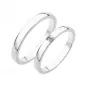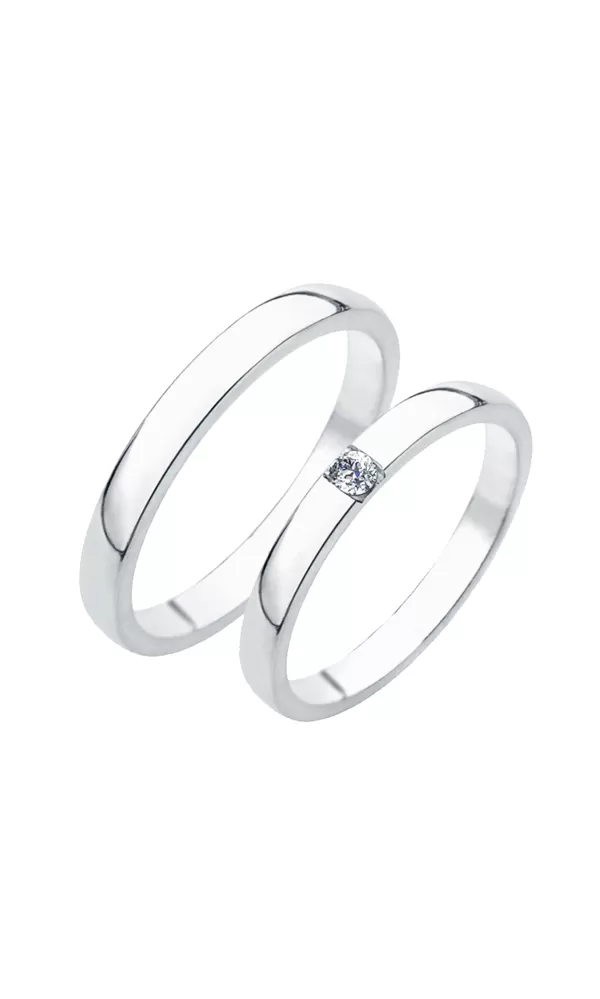 Snubní prsteny z rhodiovaného stříbra ryzosti 925/1000 půlkulatého profilu s lesklou povrchovou úpravou. V dámském prstenu je vsazen jeden kulatý zirkon popř. diamant briliantového brusu. Snubní prsteny je možné upravit podle vašich přání např. různé šířky a povrchové úpravy.