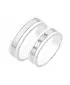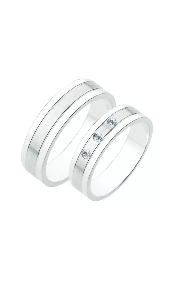 Snubní prsteny z rhodiovaného stříbra ryzosti 925/1000 v rovném profilu s kombinovanou povrchovou úpravou lesk - sametový mat, kdy matný proužek je zvýrazněm lesklými rýhami. V dámském prstenu jsou vsazeny tři kulaté zirkony popř. diamanty briliantového brusu. Snubní prsteny je možné upravit podle vašich přání např. různé šířky a povrchové úpravy.