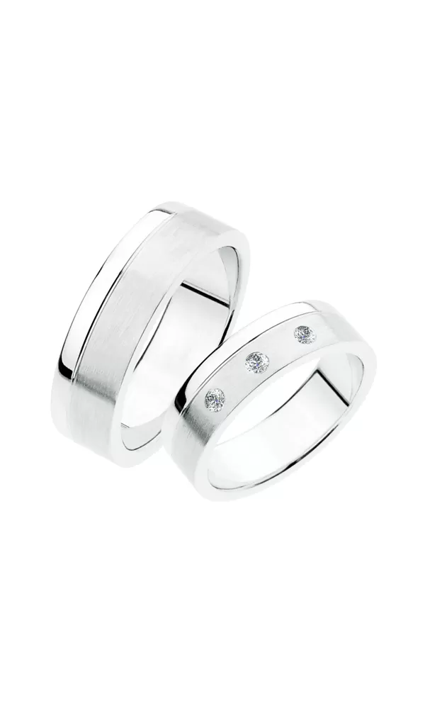 Snubní prsteny z rhodiovaného stříbra ryzosti 925/1000 rovného profilu s kombinovanou povrchovou úpravou lesk - sametový mat, který je oddělen lesklou rýhou. V dámském prstenu jsou vsazeny tři kulaté zirkony popř. diamanty briliantového brusu. Snubní prsteny je možné upravit podle vašich přání.