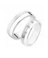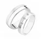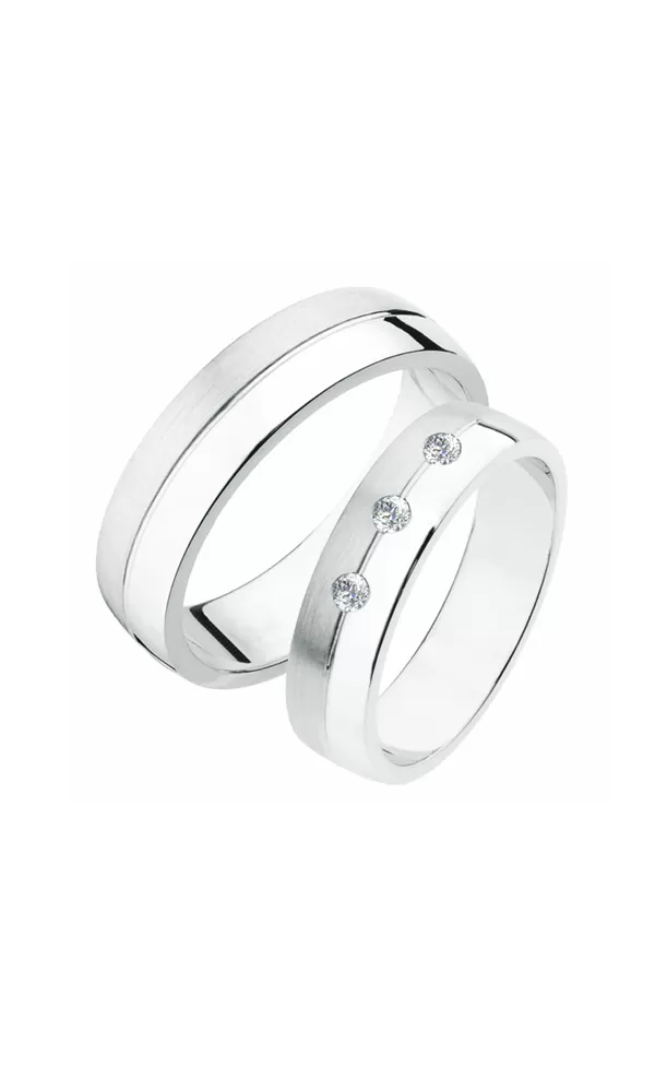 Snubní prsteny z rhodiovaného stříbra ryzosti 925/1000 rovného profilu s kombinovanou povrchovou úpravou lesk - sametový mat, který je oddělen lesklou rýhou. V dámském prstenu jsou vsazeny tři kulaté zirkony popř. diamanty briliantového brusu. Snubní prsteny je možné upravit podle vašich přání.