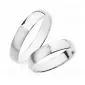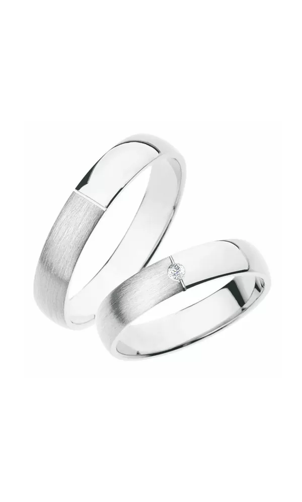 Snubní prsteny z rhodiovaného stříbra ryzosti 925/1000 půlkulatého profilu s kombinovanou povrchovou úpravou - lesk/sametový mat, oddělené lesklou rýhou. Snubní prsteny mají vnitřní Fit Profil - půlkulatou vnitřní stranu pro příjemnější nošení, nasazování a sundavání. V dámském prstenu je vsazen jeden kulatý zirkon popř. diamant briliantového brusu. Snubní prsteny je možné vyrobit v různých šířkách a v různých povrchových úpravách.