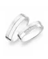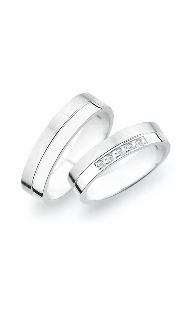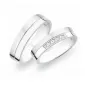 Snubní prsteny z rhodiovaného stříbra ryzosti 925/1000 rovného profilu s kombinovanou povrchovou úpravou lesk - sametový mat, který je oddělen jemnou lesklou rýhou. V dámském prstenu je vsazeno pět kulatých zirkonů popř. diamantů briliantového brusu. Snubní prsteny je možné vyrobit v různých šířkách a v různých povrchových úpravách.