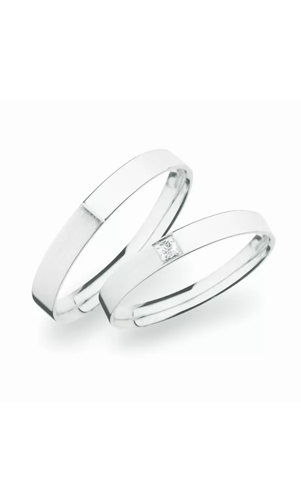 Snubní prsteny z rhodiovaného stříbra ryzosti 925/1000 rovného profilu s kombinovanou povrchovou úpravou lesk - sametový mat, který je oddělen jemnou rýhou. Snubní prsteny mají vnitřní Fit Profil - půlkulatou vnitřní stranu pro příjemnější nošení, nasazování a sundavání. V dámském prstenu je vsazen do čtverečku jeden kulatý  zirkon popř. diamant briliantového brusu. Snubní prsteny je možné vyrobit v různých šířkách a v různých povrchových úpravách.