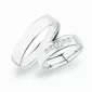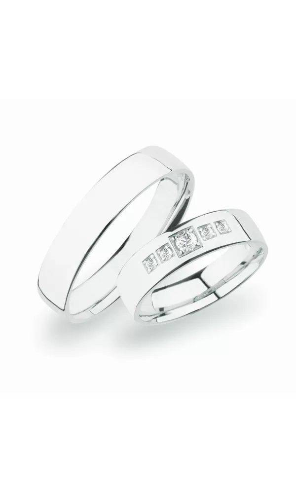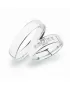 Snubní prsteny z rhodiovaného stříbra ryzosti 925/1000 mírně půlkulatém profilu s lesklou povrchovou úpravou. Snubní prsteny mají vnitřní Fit Profil - půlkulatou vnitřní stranu pro příjemnější nošení, nasazování a sundavání. V dámském prstenu je vsazen jeden vetší a čtyři menší zirkony popř. diamanty briliantového brusu. Snubní prsteny je možné vyrobit v různých povrchových úpravách.