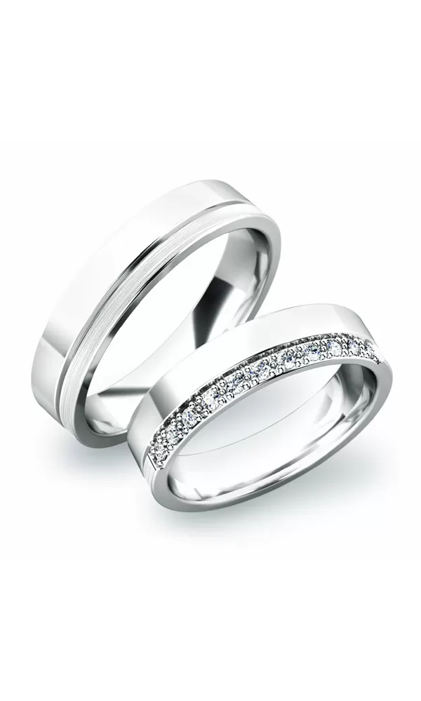 Masívne snubné prstene v rovnom profile sú vyrobené zo striebra o rýdzosti 925/1000 v kombinácii lesklej a matnej povrchovej úpravy. Snubné prstene majú vnútorné Fit Profil - polguľatú vnútornú stranu pre príjemnejšie nosenie, nasadzovanie a odnímanie. V dámskom prsteni je vsadených jedenásť okrúhlych zirkónov popr. diamantov briliantového brusu. Diamanty vynikajú svojou krásou a vlastnosťami, ktoré sú oproti iným kameňom bezkonkurenčné. Je to najtvrdší nerast, ktorý nikdy nestratí svoju hodnotu. Diamant je kráľ všetkých drahokamov a teda aj jedným z najcennejších a preto sa oplatí do šperkov s diamantmi investovať a predovšetkým pri snubných prsteňoch, ktoré sú na celý život!  Vsadzovanie zirkónov aj diamantov vykonávajú naši najskúsenejší majstri zlatníci ručne pod mikroskopom s presnosťou na 0,01 mm a preto nehrozí vypadnutie kamienkov ako to býva u strojne vyrábaných snubných prsteňov.