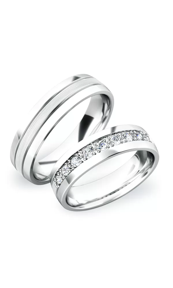 Obľúbený vzor snubných prsteňov v mierne polguľatom profile. Snubné prstene sú vyrobené zo striebra o rýdzosti 925/1000 v kombinácii lesklej a matnej povrchovej úpravy. Snubné prstene majú vnútorné Fit Profil - polguľatú vnútornú stranu pre príjemnejšie nosenie, nasadzovanie a odnímanie. V dámskom prsteni je vsadených deväť okrúhlych zirkónov popr. diamantov briliantového brusu. Diamanty vynikajú svojou krásou a vlastnosťami, ktoré sú oproti iným kameňom bezkonkurenčné. Je to najtvrdší nerast, ktorý nikdy nestratí svoju hodnotu. Diamant je kráľ všetkých drahokamov a teda aj jedným z najcennejších a preto sa oplatí do šperkov s diamantmi investovať a predovšetkým pri snubných prsteňoch, ktoré sú na celý život!  Vsadzovanie zirkónov aj diamantov vykonávajú naši najskúsenejší majstri zlatníci ručne pod mikroskopom s presnosťou na 0,01 mm a preto nehrozí vypadnutie kamienkov ako to býva u strojne vyrábaných snubných prsteňov.