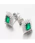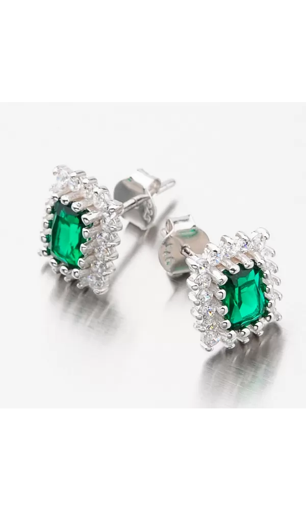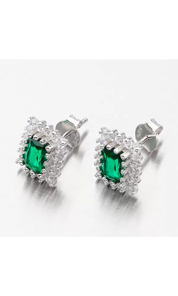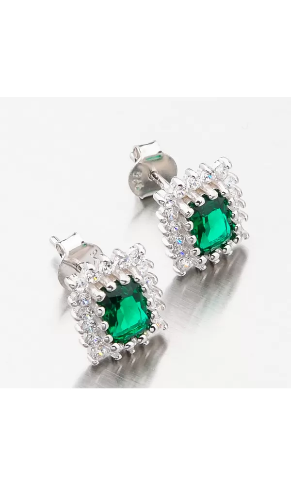 Zaujmite žiarivým náušnicami. Tento model náušníc je v hranatom tvare a vo svojom strede majú veľký zirkón v zelenej farbe brúsený do tvaru obdĺžnika. Okolo tohto zirkónu sú vsadené menšie zirkóny v briliantovom bruse. Neuveriteľná žiara zirkónov vás okúzli a bude priťahovať pozornosť okolia. Náušnice sa zapínajú na puzety.