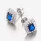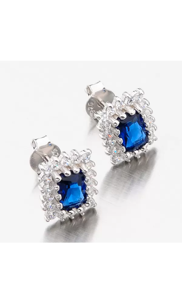 Zaujmite žiarivým náušnicami. Tento model náušníc je v hranatom tvare a vo svojom strede majú veľký zirkón v modrej farbe brúsený do tvaru obdĺžnika. Okolo tohto zirkónu sú vsadené menšie zirkóny v briliantovom bruse. Neuveriteľná žiara zirkónov vás okúzli a bude priťahovať pozornosť okolia. Náušnice sa zapínajú na puzety.