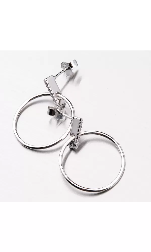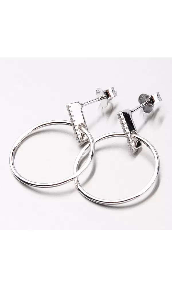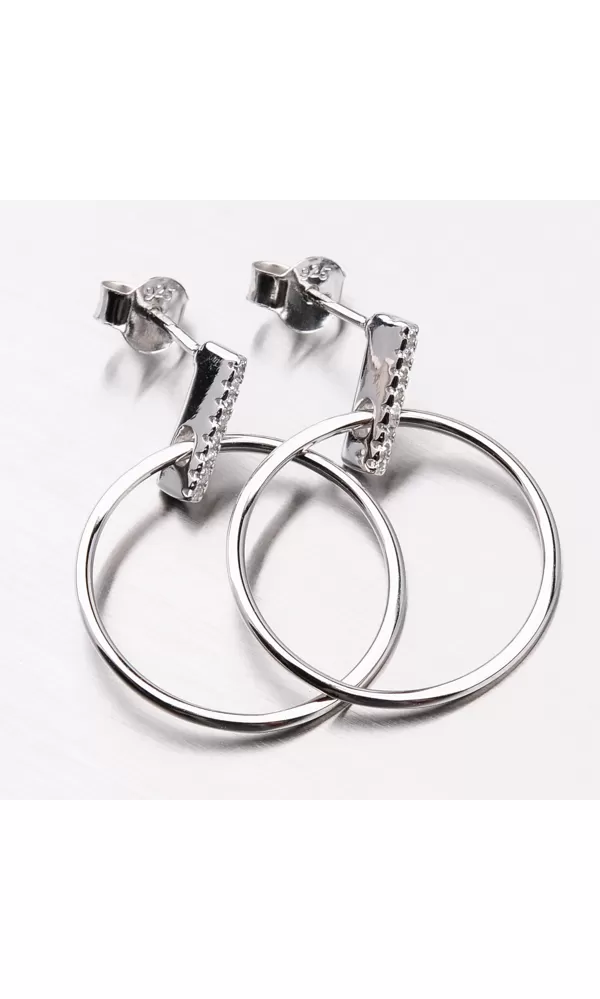 Moderné dámske náušnice potešia nielen ženy ale aj dievčatá. Sú tvorené prúžkom striebra, ktorý je celý vysadený zirkónmi v briliantovom bruse. Z prúžku visí strieborný kruh v jednoduchom dizajne, leštený do vysokého lesku. Náušnice sa zapínajú na puzetu.