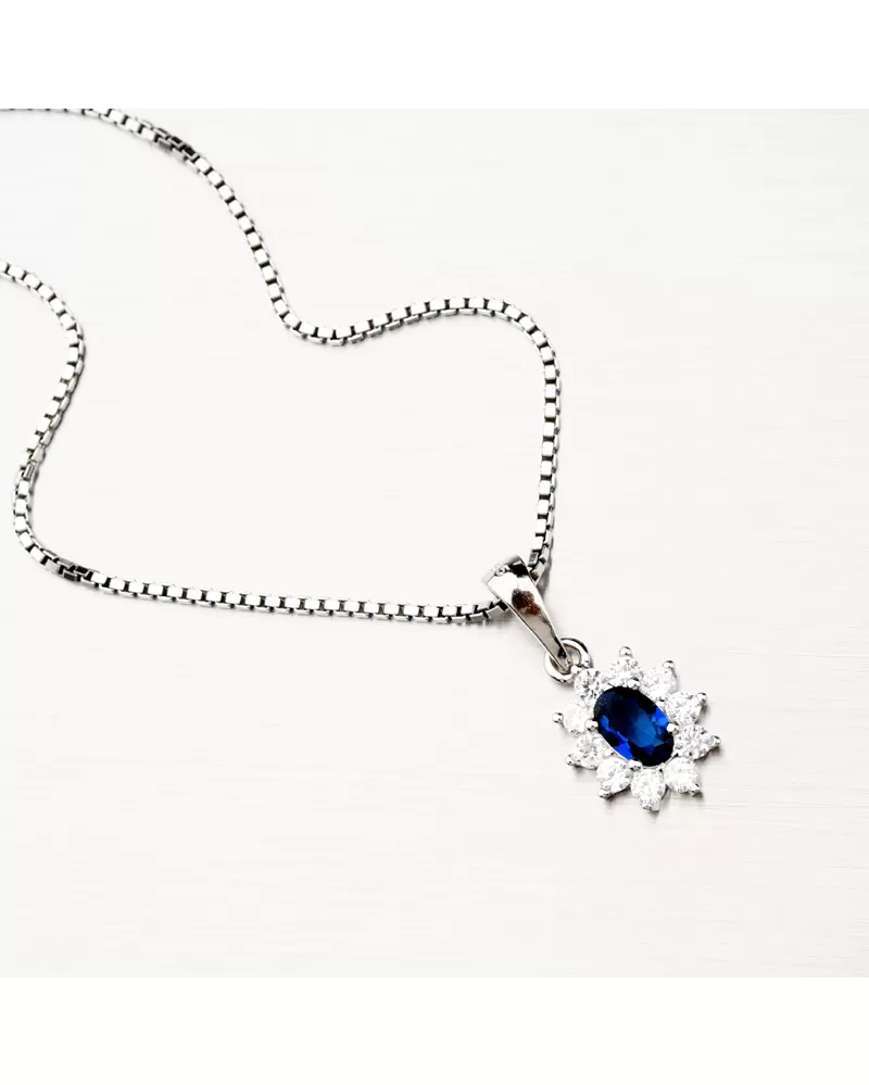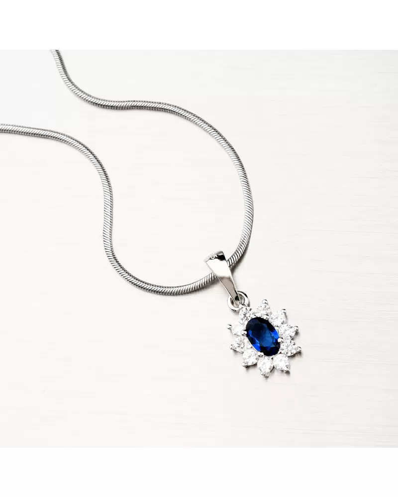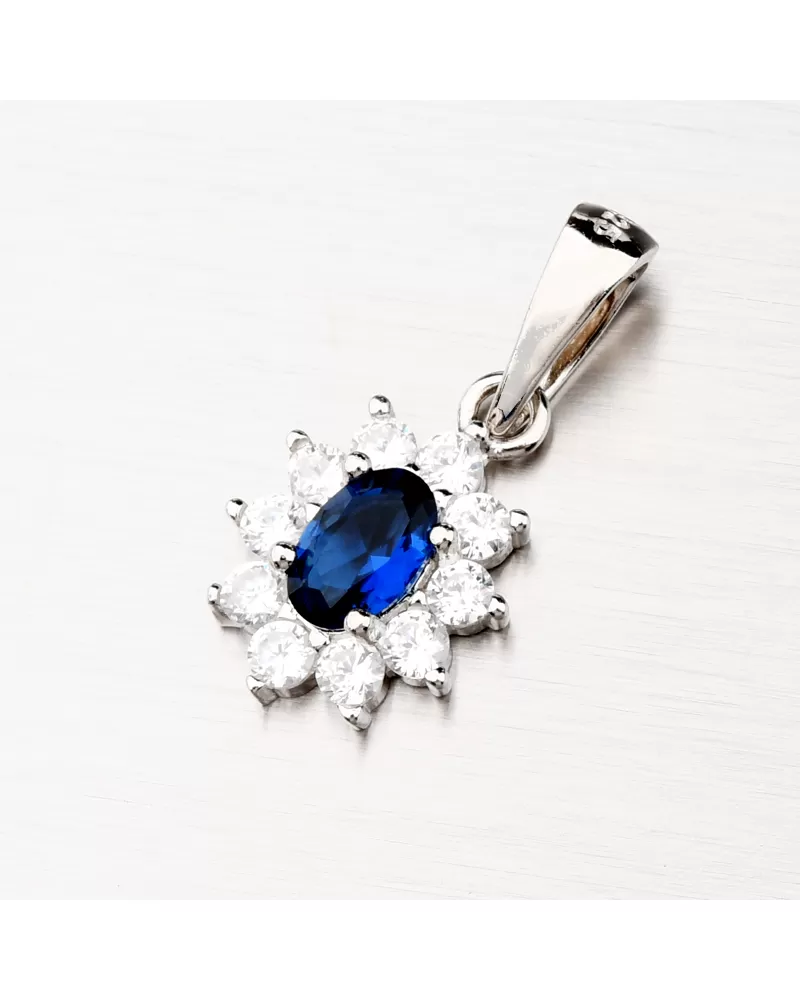 Úchvatný prívesok s dominantným tmavomodrým zirkónom v oválnom tvare, ktorý je na pevno usadený do krapien a okolo neho je vysadených 10 žiarivých zirkónov po celom obvode. Prívesok je veľmi ľahký a bude maximálne pohodlný na celodenné nosenie.